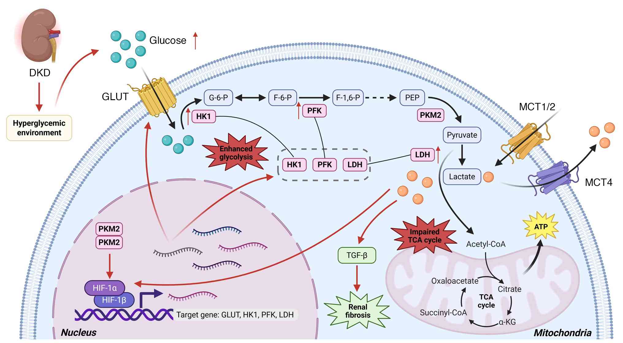 Metabolic reprogramming is increasingly recognized as a key feature of DKD, primarily driven by enhanced glycolysis and subsequent lactate accumulation. The sustained renal hypoxia observed during the initial stages of the pathological progression carries out a particularly key role in this process. Clinical investigations have established that elevated lactate concentrations and diminished redox potential are closely associated with this hypoxic state, a phenomenon analogous to, yet distinct from, the Warburg effect observed in malignant cells (11,68).