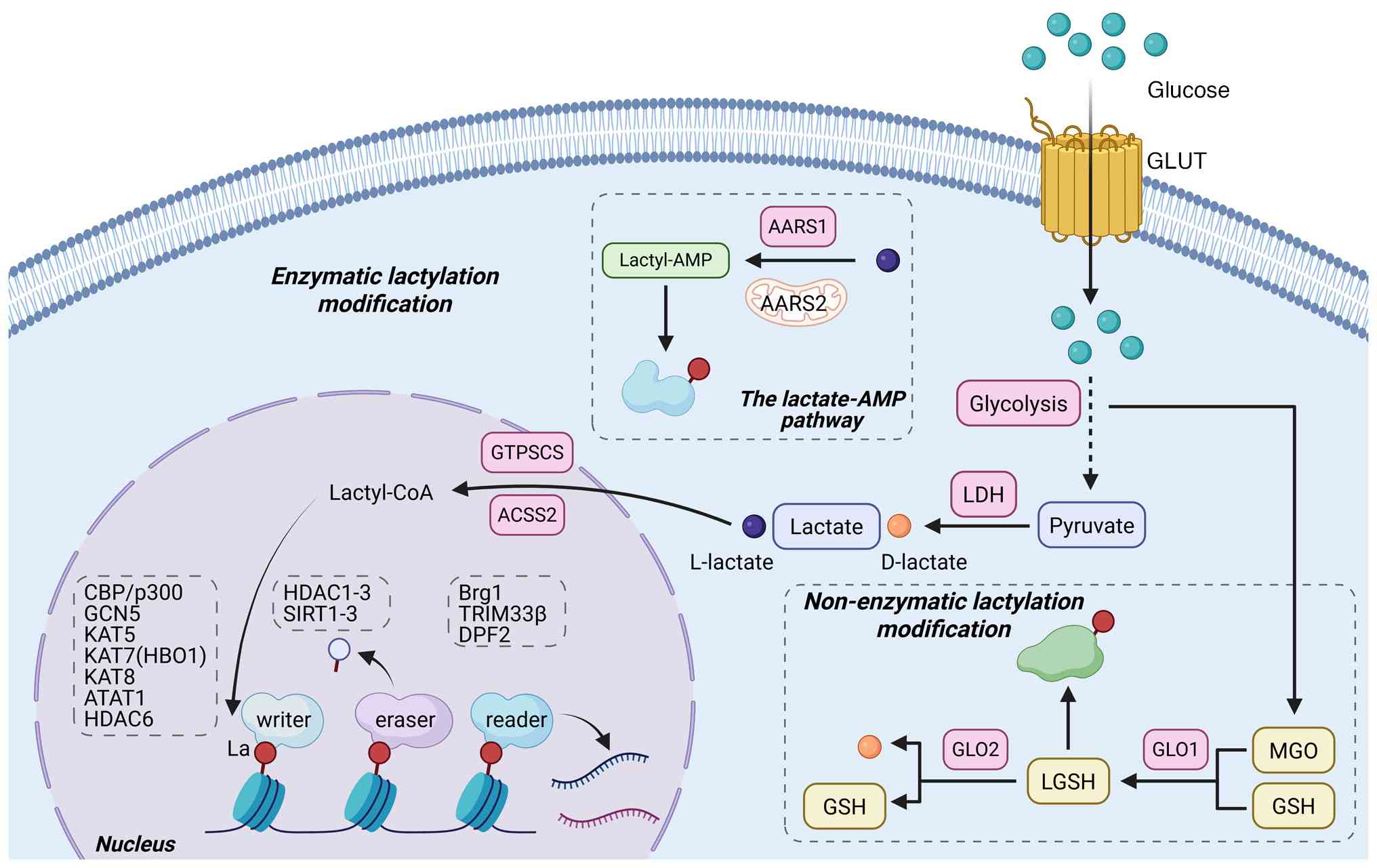 Non-enzymatic lactylation, which is distinct from its enzymatic counterpart, occurs independently of enzymatic catalysis in metabolic regulation. This process is predominantly mediated by D-lactate, which undergoes lactylation through a nucleophilic substitution reaction between S,D-lactoylglutathione (LGSH) and lysine residues (132). LGSH is synthesized by glyoxalase 1 (GLO1), which catalyzes the reaction between methylglyoxal (MGO), a byproduct of glycolysis and glutathione (GSH) (133). MGO, a well-characterized metabolic byproduct of glycolysis, is generated from glycolytic intermediates such as dihydroxyacetone phosphate and glyceraldehyde 3-phosphate (134). Under physiological conditions, MGO is detoxified by the GLO system, which comprises GLO1 and GLO2. GLO1 converts MGO into stable LGSH, whereas GLO2 hydrolyses LGSH to yield D-lactate and regenerate GSH (135).