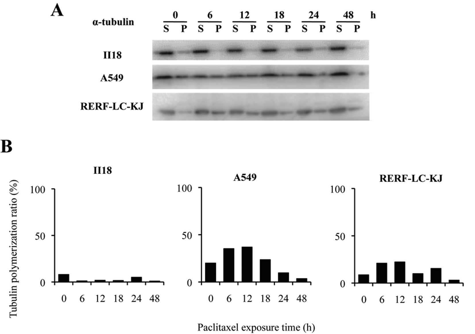 In the II18 cell line, no correlation was found between the expression level of ABCB1 and the extent of the accumulation of [3H]-paclitaxel. Therefore, we next performed tubulin polymerization assays to quantify the extent of microtubule stabilization by paclitaxel. The tubulin-polymerized ratio was defined as the percentage of polymerized α-tubulin, which was calculated by dividing the densitometric value of polymerized α-tubulin (insoluble) by the total α-tubulin contents (sum of the densitometric values for soluble and polymerized α-tubulin) (Fig. 5). The ratio of polymerized tubulin remained low for 48 h in the II18 cell line, whereas it increased until a peak value at 6 or 12 h after the exposure and decreased from 18 to 48 h in the other two cell lines.