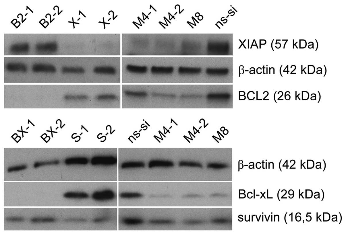 The selected target-specific siRNAs (Table I) potently decreased the mRNA expression levels of their appropriate target in both BCa cell lines 48 h after transfection (Fig. 2). In EJ28 cells, BCL2 was reduced down to 21%, Bcl-xL down to 28%, XIAP down to 37% and survivin down to 23% at best. Even 96 h after transfection a target inhibition down to 28% (survivin) and to 59% (BCL2) was measured (Fig. 3). The simultaneous inhibition of all four antiapoptotic genes resulted in mRNA downregulation of all targets. Using a combination of all eight siRNAs, BCL2 was reduced down to 61 and 43%, Bcl-xL down to 57 and 38%, XIAP down to 62 and 59%, and survivin down to 42 and 22% in EJ28 and J82 BCa cells, respectively (Fig. 2). Western blot analysis showed specific protein reduction 48 h after siRNA transfection in single target and target combination treatments in both BCa cell lines (Fig. 4, representative western blots are shown for EJ28 cells, similar results were obtained with J82 cells).