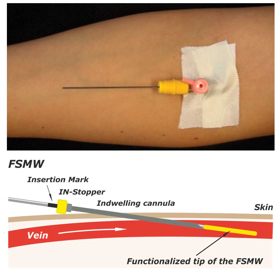 The FSMW was designed to fit into a standard 20G intravenous cannula, which is placed into the cubital vein of a cancer patient or a healthy donor (Fig. 2). An IN-Stopper (Sarstedt AG & Co.) allows secure fixation to the intravenous cannula. The FSMW is slowly pushed forward into the cannula until the EpCAM-antibody-functionalized FSMW surface of 2 cm in length is exposed to the blood flow within the lumen of the vein. The correct insertion is indicated by a mark on the distal part of the FSMW, which is not inserted into the cannula. The FSMW remains in the cubital vein for 30 min. In the present study, the insertion of the FSMW was done before the respective patient underwent surgery of the primary tumor. During the procedure of FSMW application, the patient remained in a flat or supine position. The total volume of blood coming into contact with the FSMW during the 30 min application period is estimated at 1.5–3 liters (24).