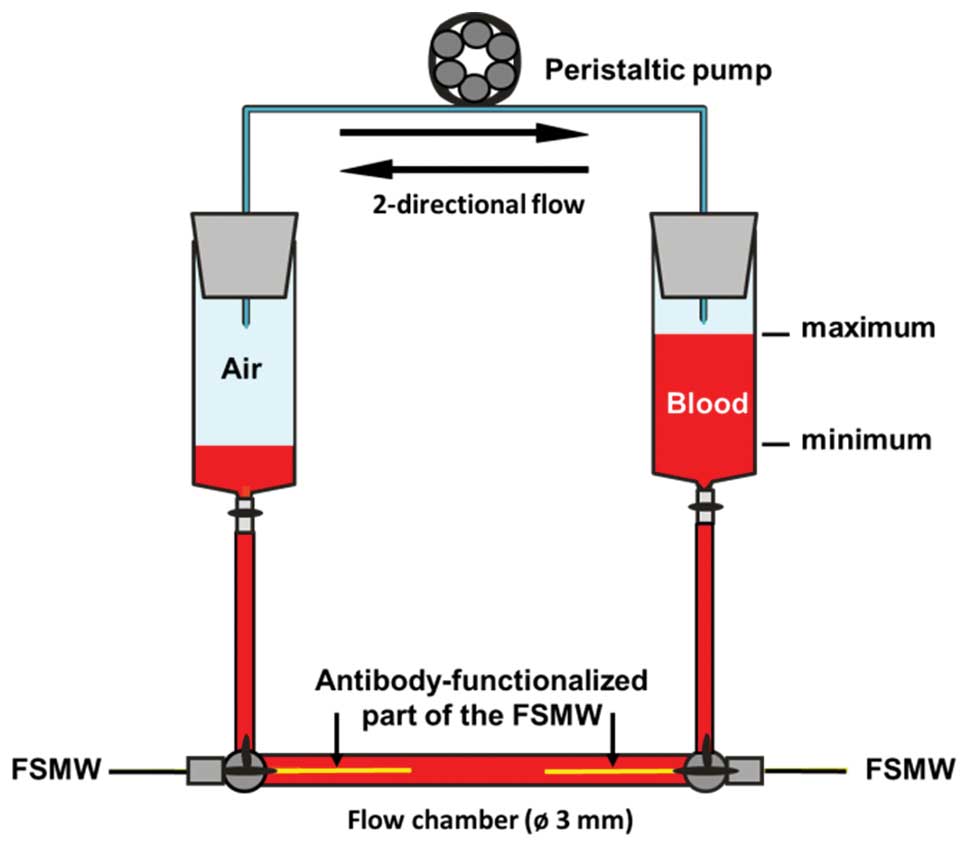 For in vitro studies of the FSMW in an in vitro flow system, peripheral venous blood from patients afflicted with breast cancer or NSCLC was harvested into EDTA-tubes (Sarstedt AG & Co., Nuembrecht, Germany). Blood samples were kept at RT and processed in the flow system at RT within 72 h after drawing of the blood.