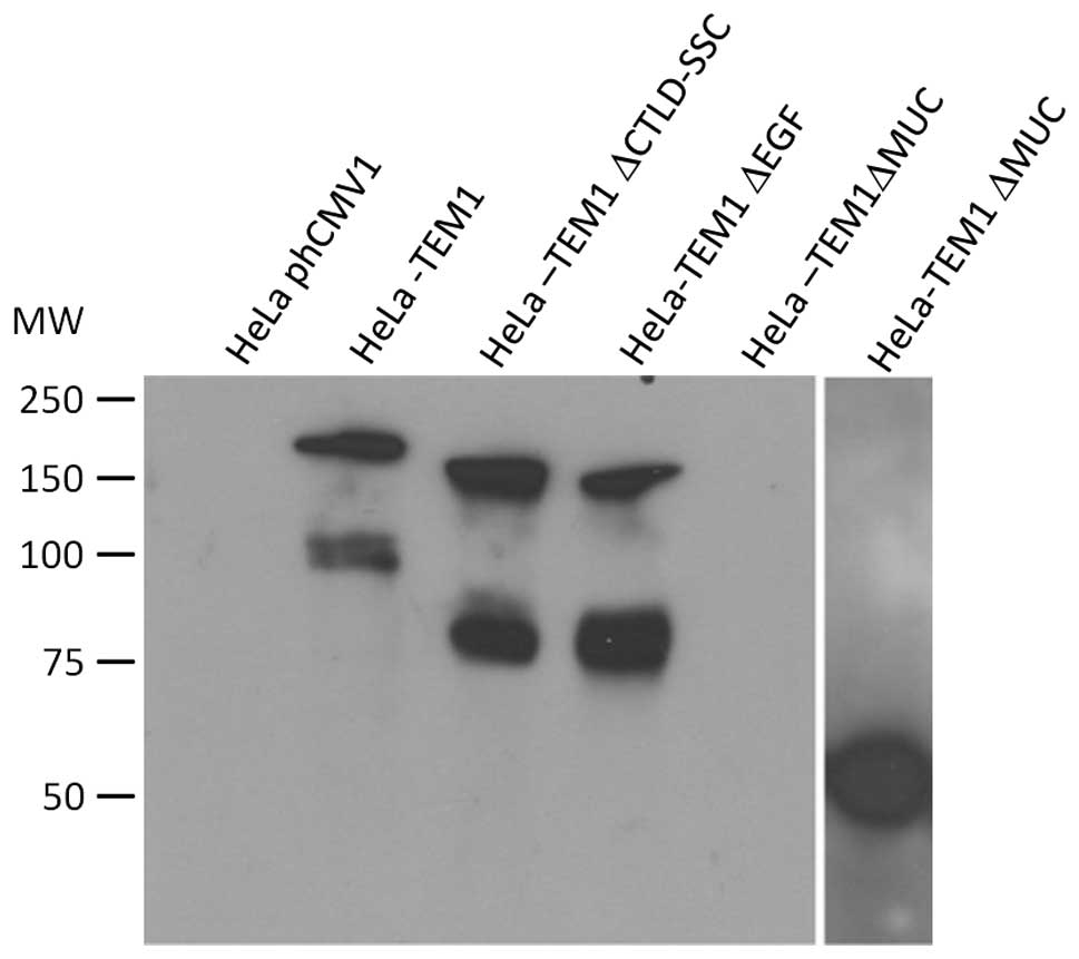 Expression of phCMV-TEM1 plasmid was described previously (29). Deletion mutants that were used to determine the epitopes of tested MAbs were constructed from this plasmid using reverse PCR. A set of primers flanking the region to be deleted was used to amplify the plasmid, the PCR product was ligated and transformed into E. coli. The deletion was verified by sequencing. Following sets of primers were used: ΔCTLD-SSC (deleted aa 28–236): FW 5′-TGCCTGGGGACTGGCTGC-3′, REV 5′-GGCACGGGGCTCAGAGC-3′, Δ EGF (deleted aa 235-356): FW 5′-ATGGGTGCCCAGGCTTCC-3′, REV 5′-GCCAGTCCCCAGGCACAG-3′, ΔMUC (deleted 359-685 aa): FW 5′-CGGTGGCTGCTGGTGGCA-3′, REV 5′-CTGGGCACCCATGGCCCC-3′.