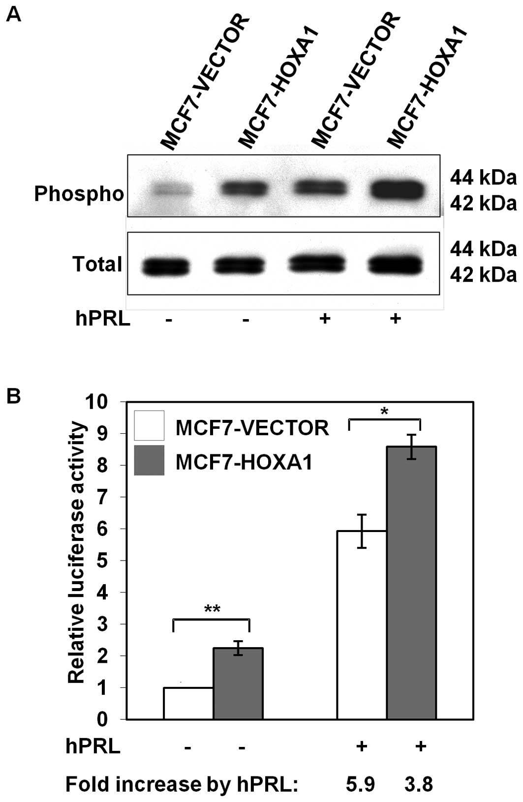We previously demonstrated that HOXA1-stimulated oncogenicity was mediated by upregulation of components, such as GRB2, MAP kinase kinase (MEK1) and SDFR1, of the p44/42 MAP kinase pathway (19). Because the MAP kinase pathway is another important cascade activated by the PRLR, we examined the effect of HOXA1 on the ability of PRL to stimulate MAP kinase activation. As shown in Fig. 3A, although HOXA1 forced expression did not affect the total amount of p44/42 kinase expression without hPRL treatment, the level of dual phosphorylated p44/42 MAP kinase in MCF7-HOXA1 cells was higher than the control MCF7-VECTOR cells. This is consistent with our previously reported study (19). When treated with hPRL, the level of phosphorylated p44/42 MAP kinase in both cell lines increased further with significantly more phosphorylation observed in MCF7-HOXA1 cells (Fig. 3A). Therefore, forced expression of HOXA1 was able to enhance PRL-stimulated MAP kinase activation in human mammary carcinoma cells.