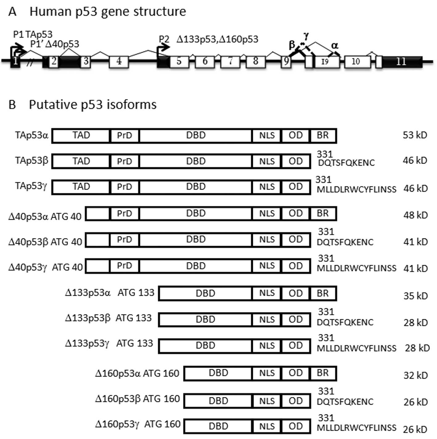 p53 is a tumor suppressor gene that regulates cell cycle arrest and apoptosis. Two p53 protein family members, p63 and p73, have structures similar to the p53 protein and their transactivation, DNA binding and oligomerization domains enable them to promote cell cycle arrest and apoptosis (3–5). Several protein isoforms of p53, p63 and p73, generated by alternative splicing and promoter use (6), have been identified as the truncated proteins at the amino (N-; ΔNp53, ΔNp63 and ΔNp73 isoforms) and the carboxy (α, β and γ isoforms) termini. p53 is known to contain a second intronic promoter that generates the N-terminally truncated ΔN proteins, Δ133p53 (7) and Δ160p53 (8). Δ40p53 isoforms can also be generated by alternative splicing and alternative initiation of translation at intron 2 (7). The N-terminal domain is essential for the transactivation of target genes and the transactivating full-length isoforms or TAp53 are functionally distinguished from the transactivation-compromised ΔN isoforms that exhibit anti-apoptotic properties. Moreover, intron 9 can be spliced in 3 different ways, leading to the formation of α, β and γ isoforms. As a whole, the human p53 gene can express 12 different isoforms of the p53 protein (TAp53, TAp53β, TAp53γ, Δ133p53, Δ133p53β, Δ133p53γ, Δ40p53, Δ40p53β, Δ40p53γ, Δ160p53, Δ160p53β and Δ160p53γ), containing different domains of the protein, due to alternative splicing, alternative promoter use and alternative initiation of translation (Fig. 1). Deletion of their N-terminal domains not only contributes to the loss of transactivation but also interferes with the transactivation of their full-length isoforms (TAp53, TAp63 and TAp73), via tetramerization of the deleted isoform and the full-length protein (9). Therefore, overexpression of the ΔN isoform proteins can inactivate the full-length p53 family proteins (10–13).