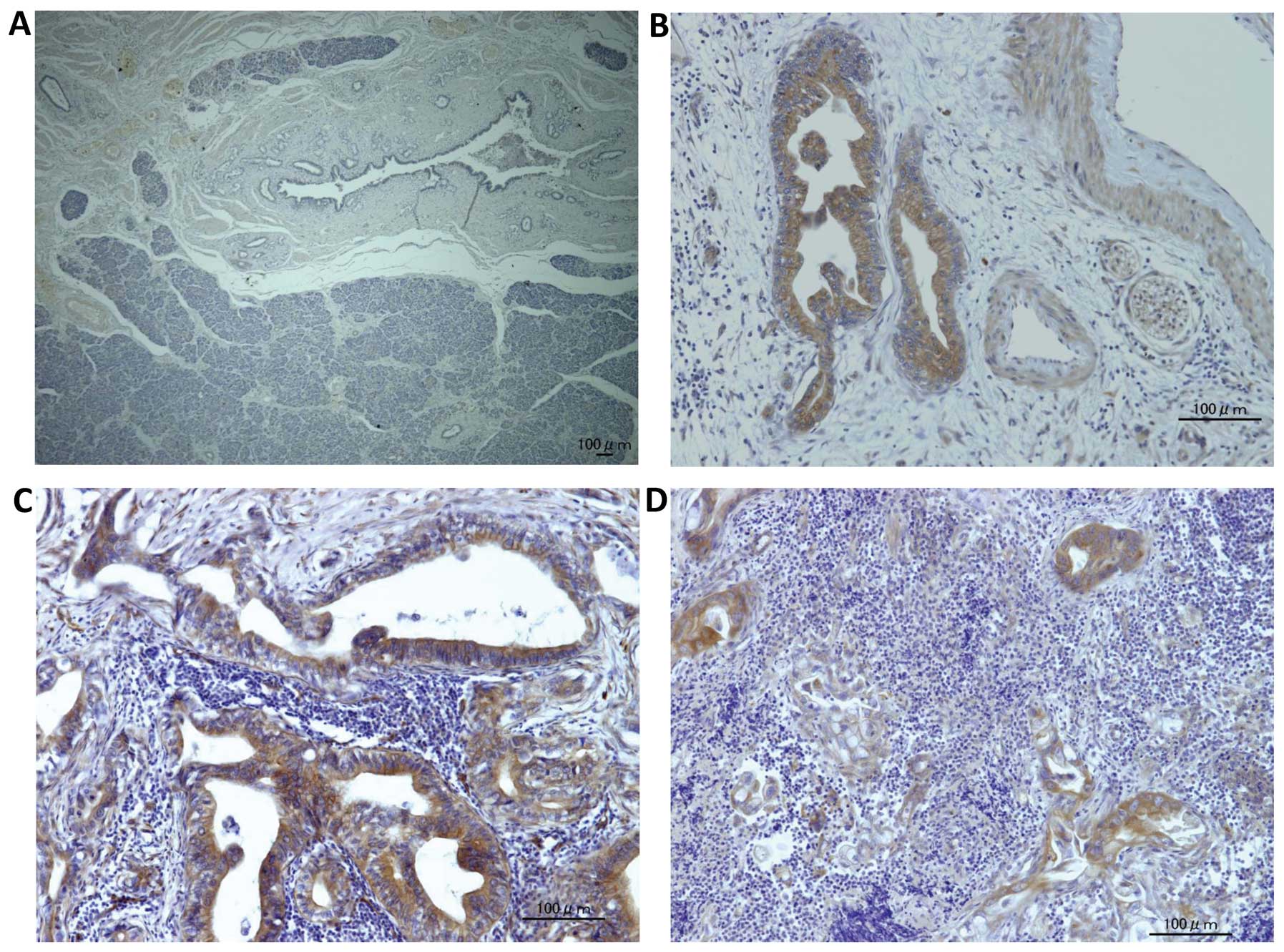 Pancreatic cancer is one of the most highly aggressive malignancies in the world. Data from the GLOBOCAN series in 2008, estimated 277,000 new cases and 266,000 deaths worldwide (1). Despite developments in diagnosis and treatment, the prognosis of pancreatic cancer remains poor. Only 10–20% of pancreatic cancer patients undergo potentially curative resection with a median survival of 17–23 months (2). Furthermore, pancreatic cancer responds poorly to most chemotherapeutic agents and radiation, resulting in little prolongation of the survival time in individual groups. The overall 5-year survival rate is 5%, and more than 50% of patients are at an advanced stage at the time of diagnosis (3). This indicates that there is a great need for novel modalities to assist in diagnostic and therapeutic strategies for management of pancreatic cancer patients.