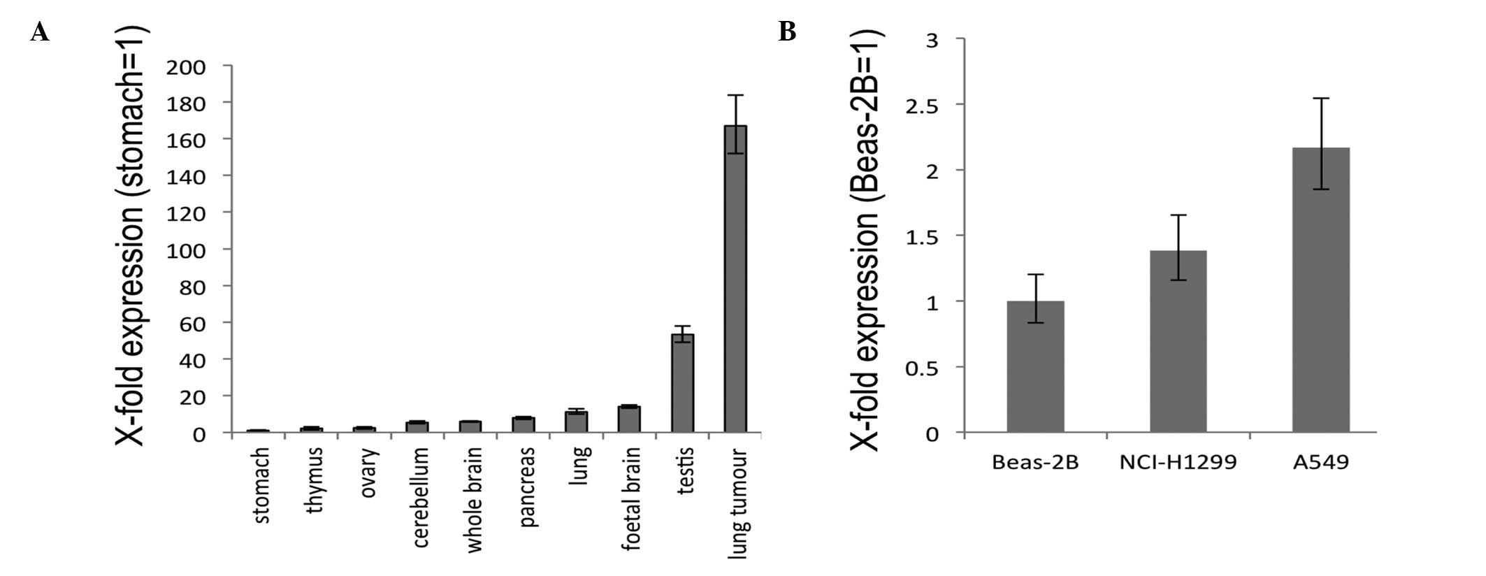 Normal lung and lung tumour specimens were obtained from the Ontario Tumour Bank (Toronto, Canada; Table I). Commercial total RNA was obtained from human stomach, ovary (FirstChoice, Invitrogen, Carlsbad, CA), cerebellum, thymus, whole brain, lung, testis, foetal brain, lung adenocarcinoma and pancreas (Clontech, Mountain View, CA).