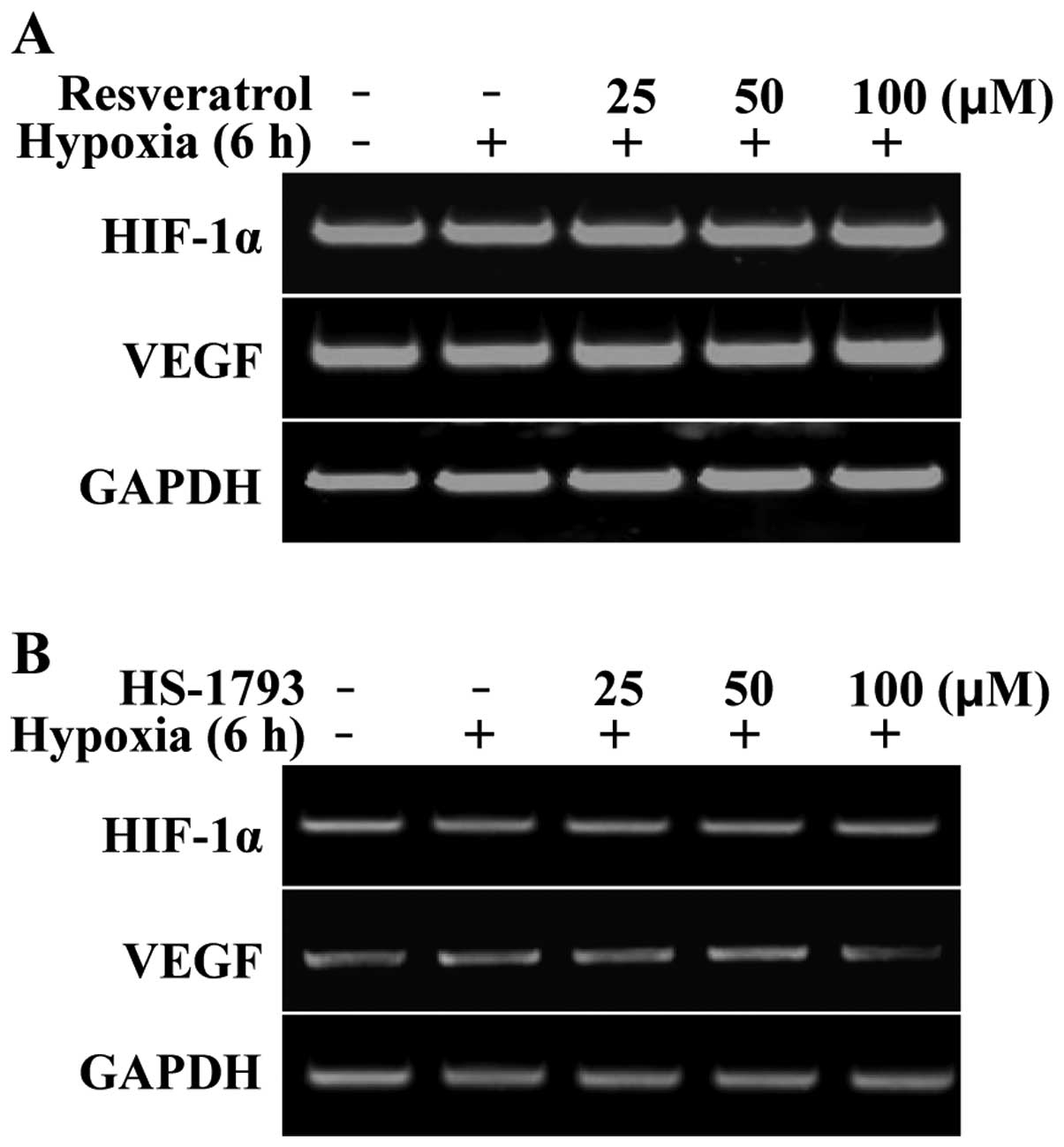 As the downregulation of HIF-1α protein levels by resveratrol and HS-1793 would be caused by a decrease in its mRNA level, the effects of HS-1793 and resveratrol on the expression of HIF-1α mRNA levels under hypoxic condition were measured by reverse transcriptional-PCR. The cells were pretreated with medium containing 25–100 μM resveratrol or HS-1793 for 1 h at normoxia then transferred hypoxia chamber and exposed to hypoxia for another 6 h, then mRNA sample was collected. As shown in Fig. 5A, resveratrol did not affect HIF-1α and VEGF mRNA expression under hypoxic conditions, neither did HS-1793 affect HIF-1α and VEGF mRNA expression under hypoxic condition in PC-3 cells (Fig. 5B). These results indicated that the inhibition of HIF-1α expression under hypoxic condition by resveratrol or HS-1793 was not through the reduction of mRNA level, suggesting post-transcriptional mechanisms of resveratrol or HS-1793 actions on HIF-1α expressions.