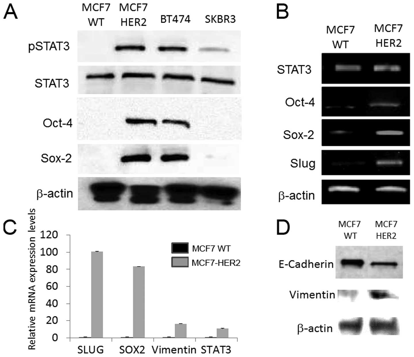 Transcription factor slug, which has been implicated as a driver for the epithelial-mesenchymal transition (EMT) was upregulated in MCF7-HER2 cells (Fig. 1B), leading us to the hypothesis that, HER2 induced stem cell marker expression and slug upregulation promoted the EMT phenotype in MCF7 cells. Real-time PCR analyses showed the gene expression pattern matching with the mesenchymal microenvironment, showing significant upregulation in vimentin, slug and concurrent downregulation of E-cadherin in MCF7-HER2 compared with control MCF7 wild-type (Fig. 1C). In line with the PCR data, western blot analyses revealed that epithelial marker E-cadherin was downregulated, while mesenchymal maker vimentin was upregulated in HER2 transfected MCF7 cells (Fig. 1D). These results indicate that the sequential activations elicited by HER2 amplification converge into the HER2-pSTAT3-stem cell markers - early EMT characteristics in signal pathways.