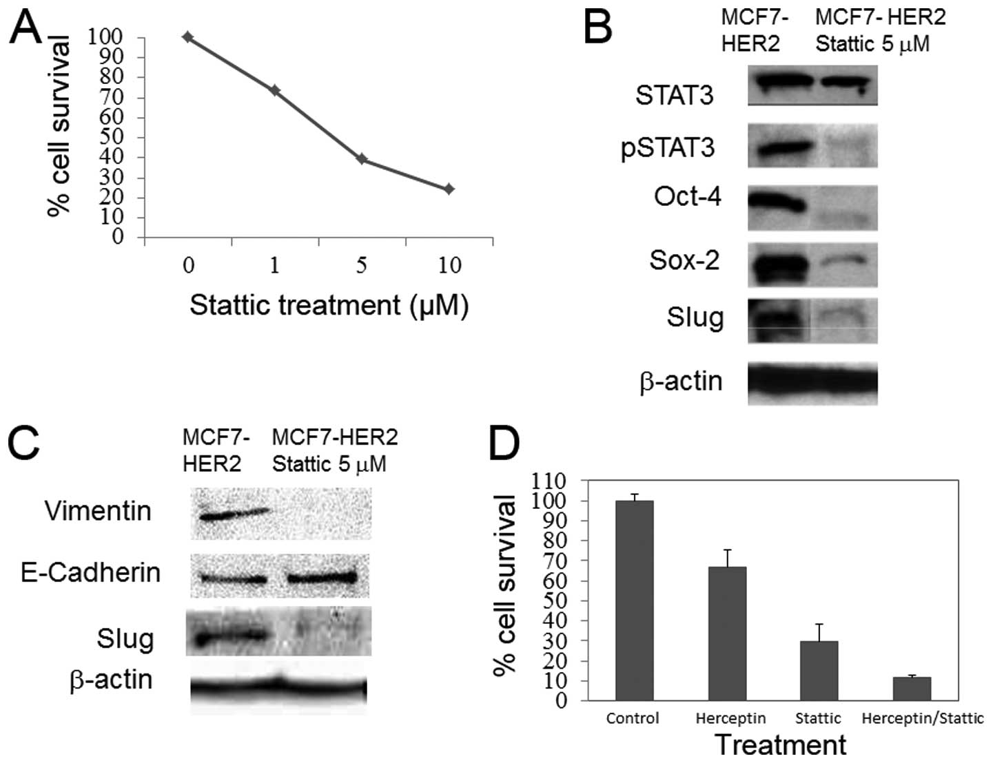 To begin with, dose response to Stattic was monitored in MCF7-HER2 cells (Fig. 2A). Stattic treatment of 5 μM resulted in 28% of cell survival. Western blots of the MCF7-HER2 cells treated with 5 μM of Stattic illustrated inhibition of STAT3 activation, as expected, but also showed significantly diminished Sox-2, Oct-4, and slug expression to the point of abrogation (Fig. 2B). While total STAT3 was almost intact with the Stattic treatment, pSTAT3 expression was also abolished simultaneously. For EMT marker expression, we monitored expression of E-cadherin, vimentin and slug protein. In agreement with cancer stem cell markers, the expression levels of EMT markers, vimentin and slug, were clearly decreased upon Stattic treatment (Fig. 2C). Our data suggest that STAT3 activation is responsible for the stem cell marker expression in HER2-overexpressing breast cancer cells.