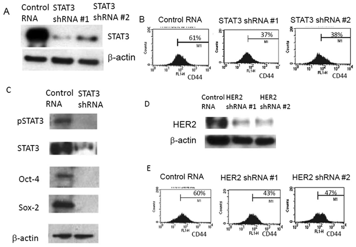 STAT3 specific inhibitor Stattic treatment convincingly abolished the stem cell phenotype. To test whether STAT3 drives the stem cell phenotype in breast cancer cells, we knocked down STAT3 gene by shRNAs and examined the CD44+ subpopulation by fluorescence activated cell sorting (FACS). Targeted STAT3 knockdown was confirmed by western blot analysis and subsequently applied to FACS analysis (Fig. 3A). When STAT3 expression was knocked down with two independent shRNAs, the CD44(+) subpopulation has clearly reduced from 61.21% (CD44+ of the control RNA) to 37.22% and 38.23%, respectively (Fig. 3B). In agreement with FACS data, western blot analyses of STAT3 knockdown cells also showed downregulation of stem cell marker expressions (Fig. 3C). These results suggest that STAT3 plays a clear role in inducing the expression of stem cell markers Oct-4, Sox-2 and CD44.
