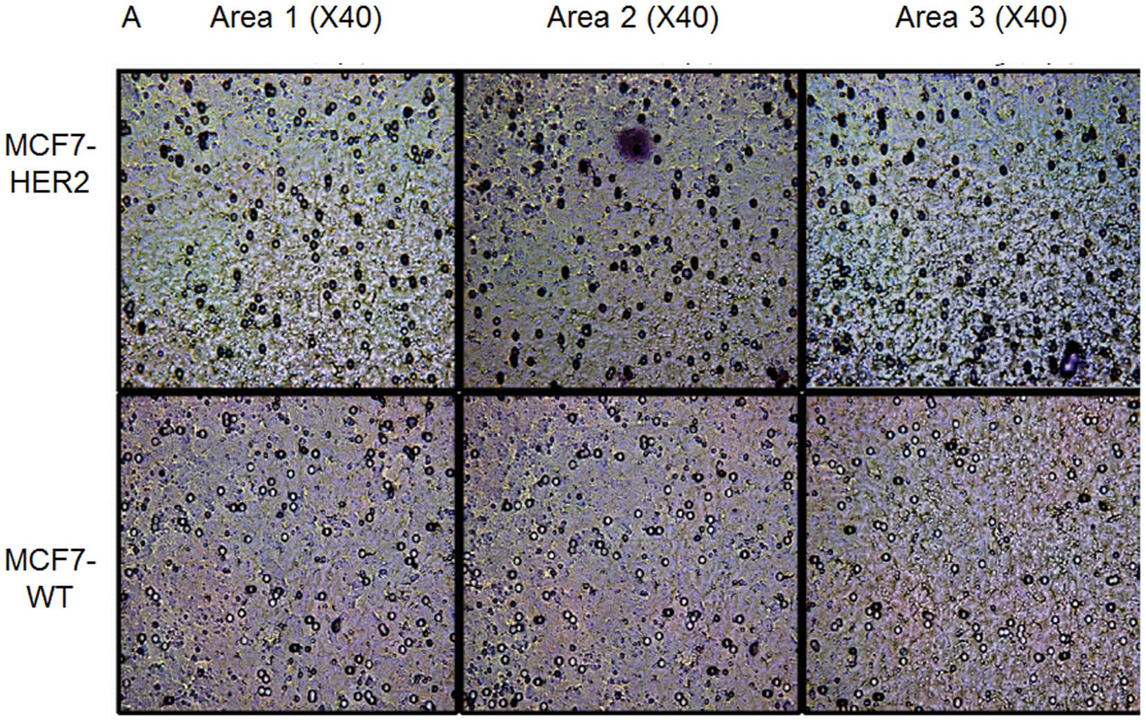 Mouse fibroblasts (NIH-3T3) were used as a chemo-attractant, and grown in a 24-well plate in 2 ml of the same media as MCF7-HER2 cells. MCF7 WT and MCF7-HER2 experimental cells were synchronized to an equal number (125,000 cells) in a 6-well plate and were serum starved overnight. Boyden chambers were prepared with 25 μl of 1:6 diluted Matrigel and allowed to incubate for about 2 h to solidify. After cell synchronization, invasion was allowed to occur for 40 h. The cells were then fixed with 0.5% glutaraldehyde and stained with 5% toluidine blue for cell counting. Three different microscope fields of ×40 were used to quantify the invasion statistics when counting cells.