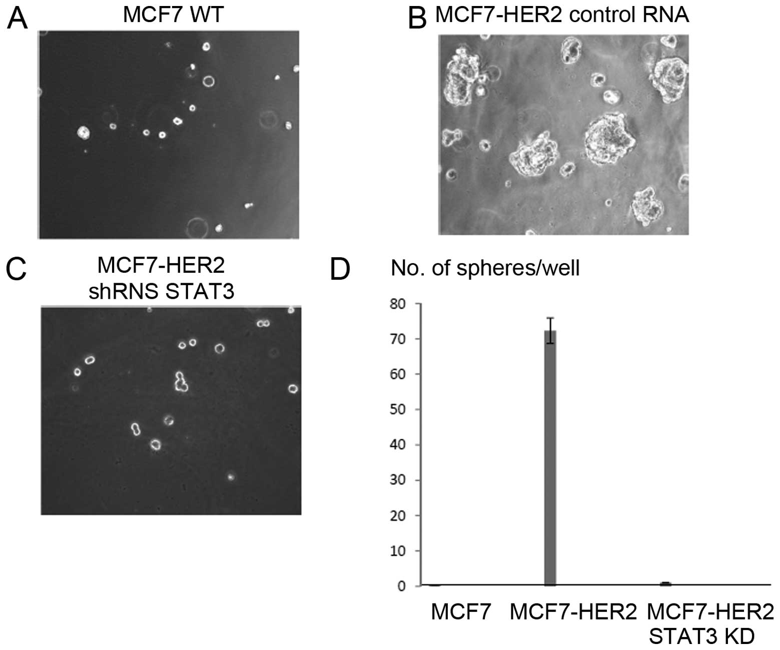 Formation of spheres by tumor cells is often directly correlated with cancer stem cell phenotype. Having considered Oct-4, Sox-2 and CD44 expression data, we wished to determine the tumorsphere formation capacity with HER2-overexpressing breast cancer. Approximately 20,000 cells were seeded on each Matrigel 3D well and tumorsphere formation was observed up to 15 days. While MCF7 WT did not form any spheres, HER2-overexpressing MCF7 cells formed stable tumorspheres at day 6 (Fig. 5A and B). To verify that the tumorsphere forming capacity is due to STAT3, we repeated the 3D culture with the targeted STAT3 knockdown cells. As shown in Fig. 5C, the figure, STAT3 knockdown cells did not form any spheres. The tumorspheres were counted for each well and presented as a graph (Fig. 5D). These results are consistent with the STAT3 knockdown effects on expression of stem cell markers Oct-4, Sox-2 and CD44. STAT3 is necessary for tumorsphere formation in HER2-overexpressing cancer.