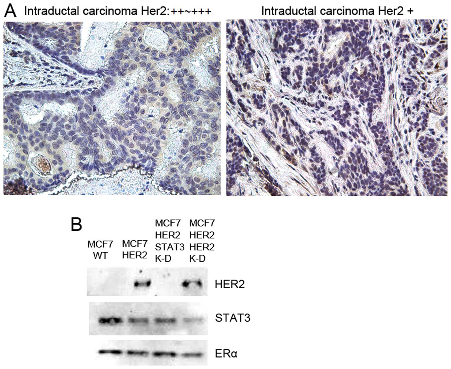 The HER2 short hairpin RNA (shRNA) and control shRNA were purchased from the Ori Gene (Rockville, MD). The transfection was performed by using Lipofectamine 2000 (Invitrogen) reagent following the manufacturer’s instructions. The STAT3 shRNA was a kind gift of Dr Hyung-Gyoo Kang at the Children’s Hospital in Los Angeles. The HER2 and STAT3 shRNA knockdown expressions after shRNA transfection were determined by a Western blot analysis at 48–72 h of transfection.