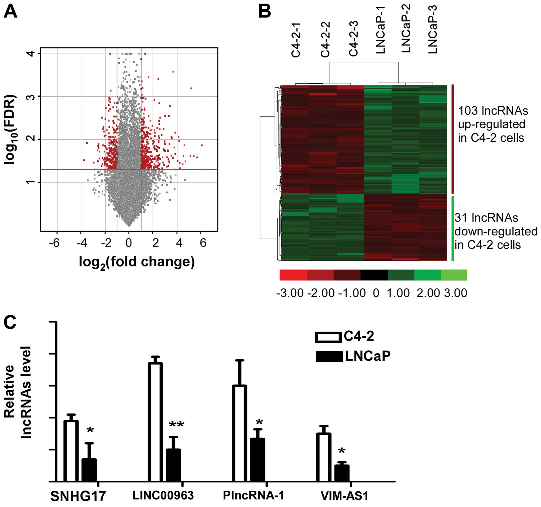 Emerging evidence indicates that LncRNAs which are RNA specis >200 bp in length (9) and frequently polyadenylated (10), are involved in physiological aspects of cell-type determination and tissue homeostasis (11), and in cancer lncRNAs are known to play important roles in carcinogenesis and tumor progression (12–16). One of the overexpressed lncRNAs in prostate cancer, PCGEM1, is tissue specific and PCa-associated lncRNA gene (15), whereas another highly expressed lncRNA, PRNCR1 (PCAT8), is pervasively transcribed from the critical region of 8q24 Region 2, which is significantly associated with PCa susceptibility (17). Previous studies also demonstrated that a novel long non-coding RNA (named PlncRNA-1) was frequently overexpressed in PCa cell lines and tissues and associated with cell viability and cell apoptosis (18). Recent studies have revealed the contribution of other lncRNAs as proto-oncogenes, drivers of metastatic transformation and tumor suppressor genes in prostate cancer, such as prostate cancer gene 3 (PCA3), metastasis associated in lung adenocarcinoma transcript 1 (MALAT-1), and PCAT-1 (13,19–21). However, the global expression profile of lncRNAs in androgen-dependent (AD) to androgen-independent (AI) prostate cancer is not fully uncovered.