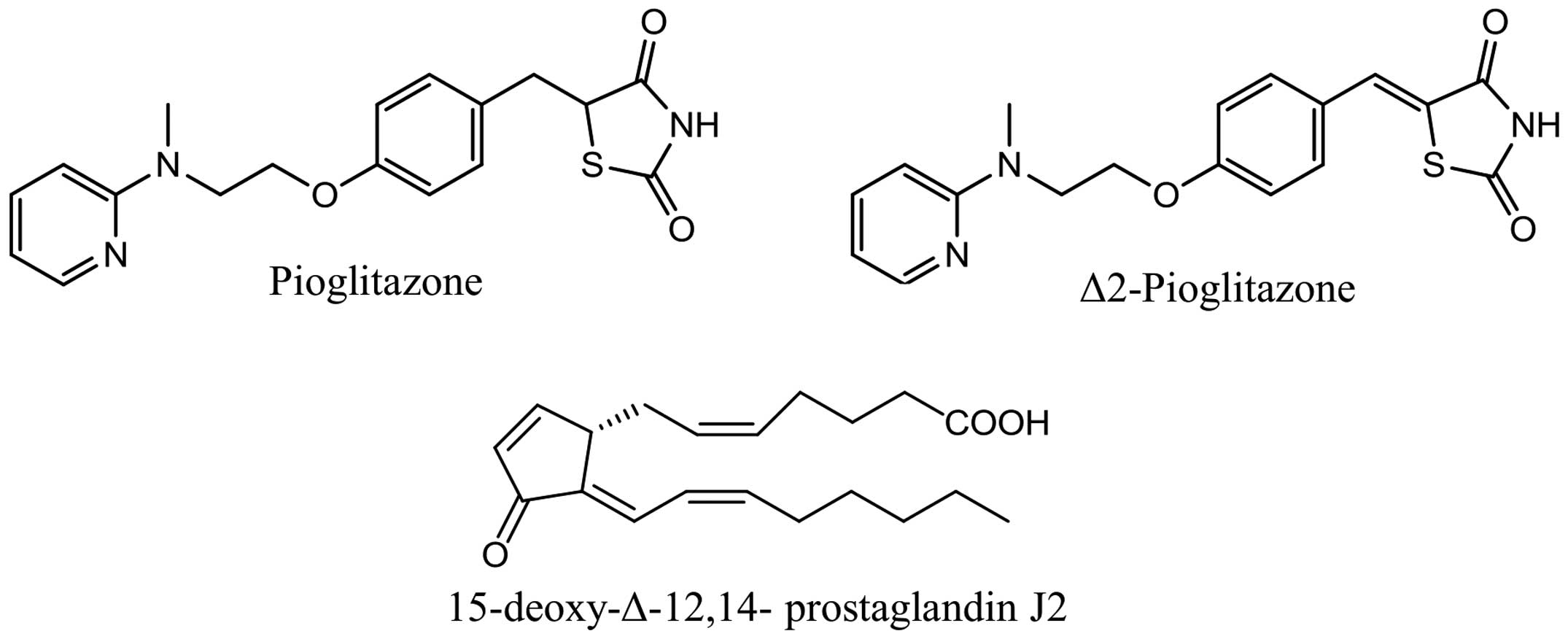 Inhibition of cell proliferation by independent PPARγ activation was demonstrated using PPARγ−/− mouse embryonic stem cells treated by the cognate ligand (9). Using siRNA, knockdown of PPARγ does not affect the ability of TZD to induce apoptotic death (6). PPARγ inactive analogues of TZDs were also synthesized by introducing a double bond adjoining the terminal thiazolidine-2,4-dione ring, resulting in the Δ2-analogue of the corresponding TZD. These analogues were developed in order to discriminate PPARγ-dependent from -independent effects of TZDs since the Δ2-TZDs have no PPARγ activating action. Among them, Δ2-troglitazone has a similar action on prostate carcinoma cell growth as the parent molecule (10).