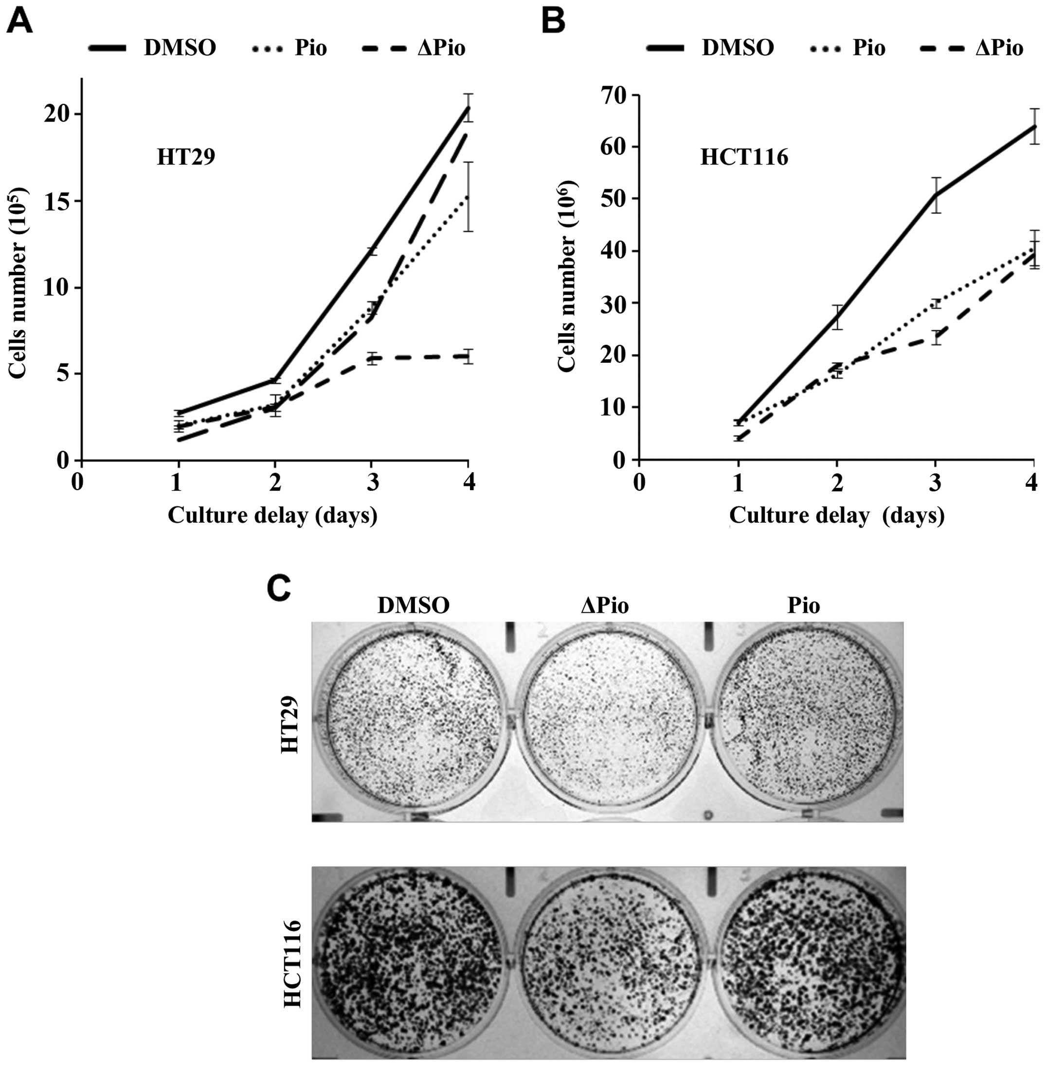 Herein, we evaluated the potential of ΔPio as an anticancer drug on human colon adenocarcinoma-derived colon HT29 and HCT116 cells. The results obtained were compared to those obtained with Pio. We studied the cellular modifications occurring within colorectal cells, i.e. mediated-stress cell responses after cell exposure to each drug,