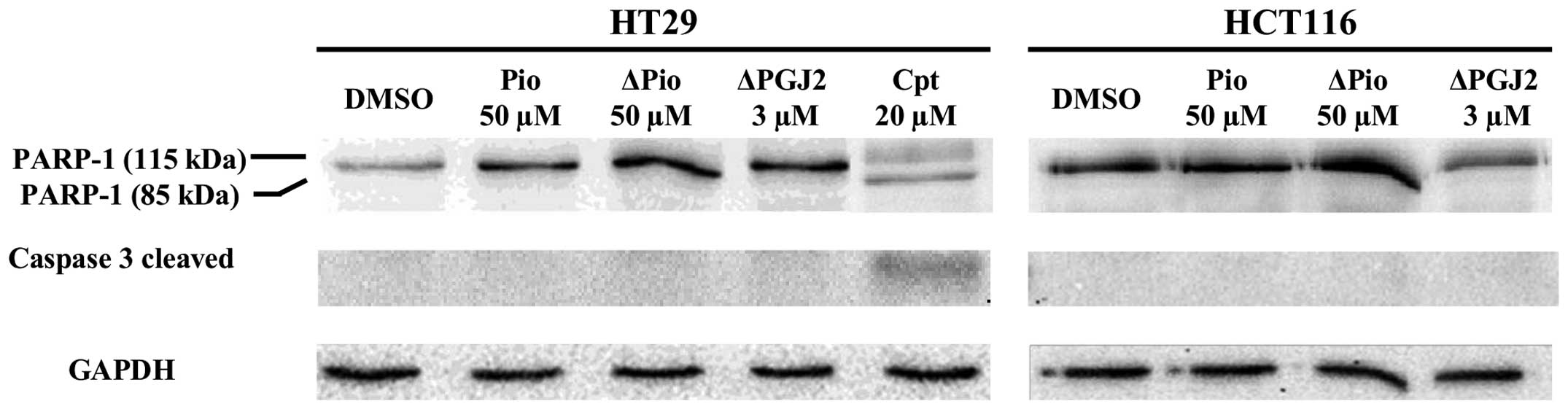 In a first set of experiments, we assessed whether ΔPio was efficient in inhibiting colon cancer-derived cell growth since the molecule had little effect on prostate carcinoma cells (10). ΔPio cytotoxicity was estimated by the MTT procedure and the trypan blue coloration method. The IC50 was, respectively, 53.7±2.8 and 46.2±2.4 μM in HT29 and HCT116 cells. We established cell growth kinetics for HT29 and HCT116 cells treated with 50 μM ΔPio over four days; the results were compared to those obtained after cell exposure to 50 μM Pio (Fig. 2A). HT29 cells in the presence of ΔPio reached the plateau phase of growth after three days of treatment. In contrast, cell growth was decreased up to 35% at the end of the experiment when HT29 cells were treated in the presence of Pio (Fig. 2A). A 40%-decrease was obtained when HCT116 cells were exposed to each molecule, but the effect of ΔPio, previously found in HT29 cells, was not observed with these cells (Fig. 2B). Anchorage-dependent assays were performed with both cell lines (Fig. 2C) and the results obtained confirmed the higher anti-proliferative property of ΔPio. The impact of ΔPio treatment on cell growth was associated with the alteration of cell distribution in cell cycle phases. Cell exposure to this drug resulted in cell accumulation in G0/G1-phase, whereas Pio treatment enhanced cell distribution in S-phase (Table I). However, HT29 or HCT116 cell growth arrests were not associated with apoptosis cell death. As shown in Fig. 3, neither caspase-3 activation nor PARP-1 cleavage was found in protein homogenates prepared from ΔPio or Pio-treated cells. In contrast, protein cleavage was obtained when HT29 cells were treated for two days in the presence of 20 μM camptothecin used as an inducer of apoptosis.