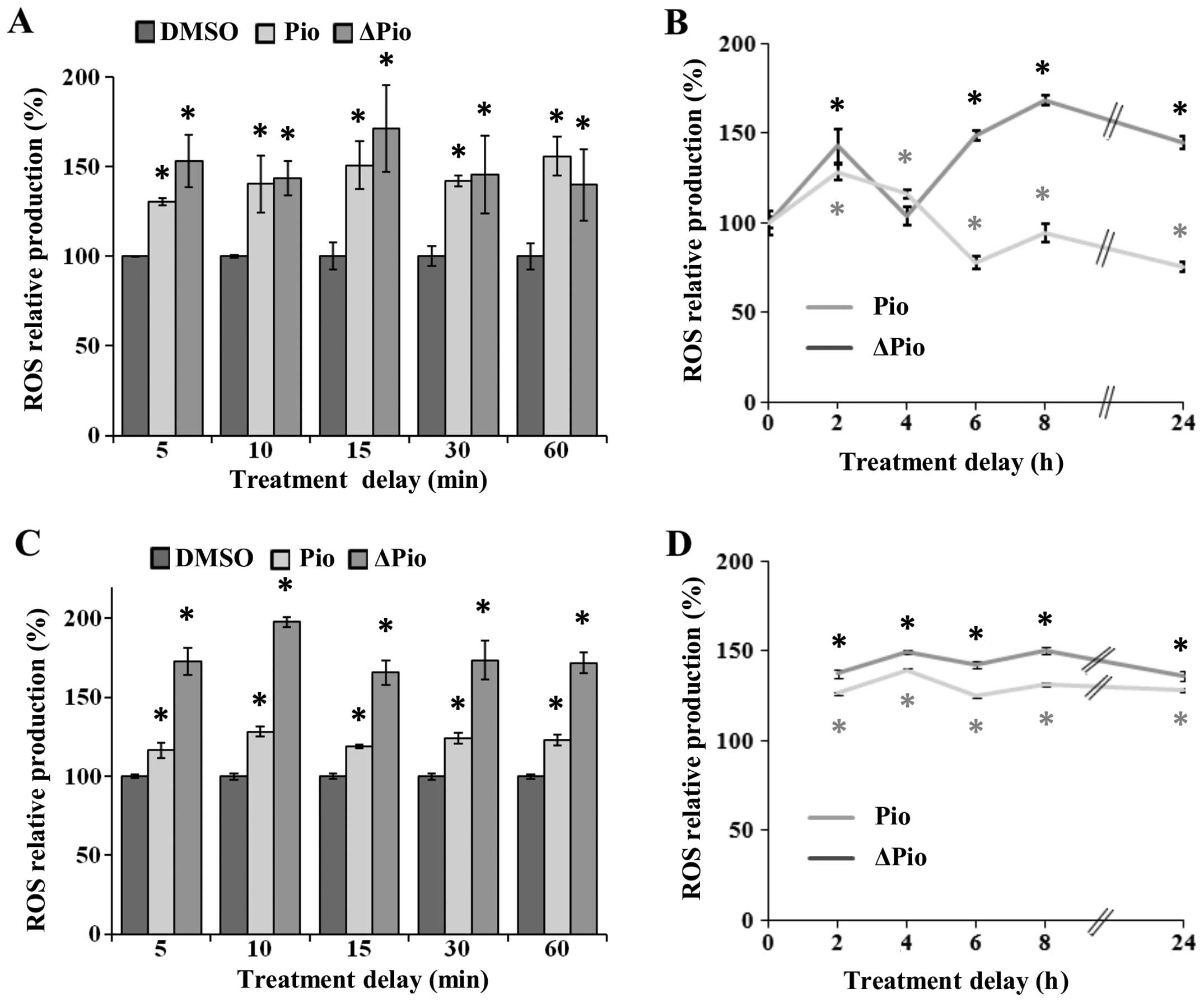 Finally, we showed that at a comparable dose (50 μM), ΔPio and Pio did not have a similar impact on HT29 cells compared to that obtained with HCT116 cells. However, the Pio concentration used was nearly 20 times higher than the serum concentration in human after an oral administration of 30 mg Pio (5). We could not exclude that the results observed after cell exposure to ΔPio reflected similar effects on cell redox alteration as those obtained with Pio.