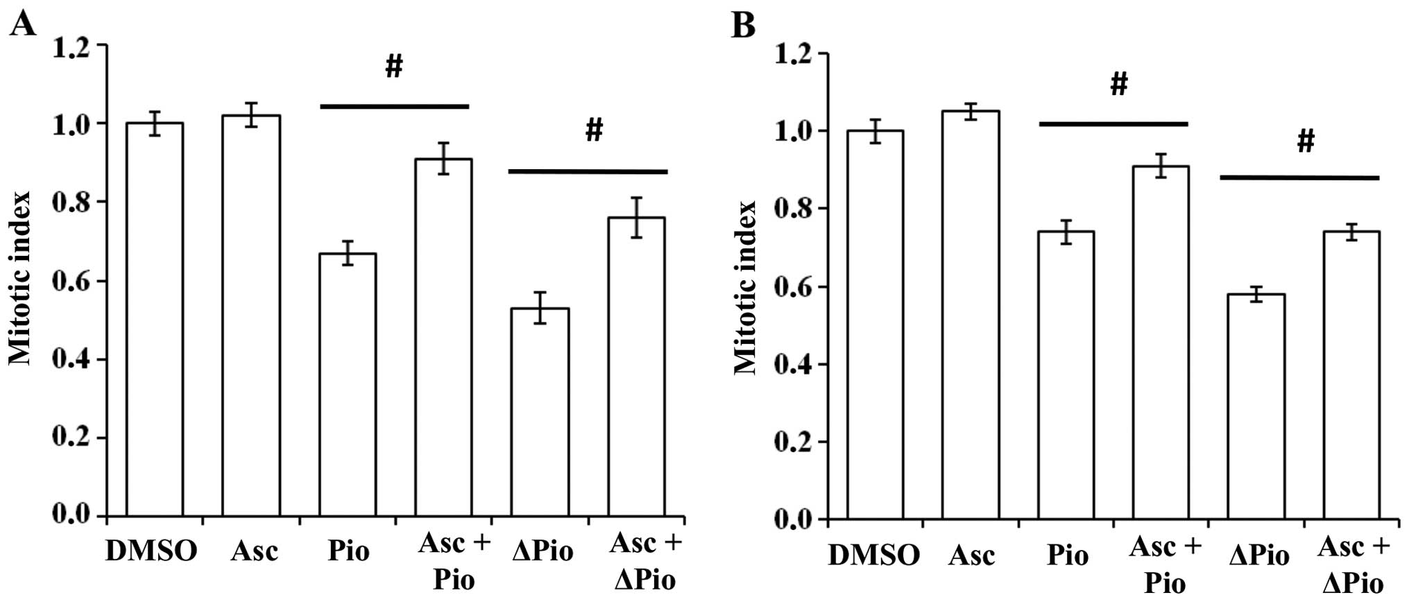 Cell growth kinetics with ΔPio (50 μM) or Pio (50 μM) were established for HT29 and HCT116 cells. Cells were seeded in 6-well plates and treated for 4 days. Control cells were treated with 0.1% (v/v) of DMSO. Then, cells were harvested by trypsination [0.02% (w/v) trypsin/2 mM EDTA solution, Eurobio], and 100 μl of cell suspension was mixed to an equal volume of 0.04% (v/v) trypan blue solution prepared with Dulbecco’s phosphate-buffered saline (DPBS, Eurobio) and living cells were counted using a Malassez hematometer. Cell growth was also tested with ΔPio or Pio together with 1 mM ascorbic acid for three days. Cells were harvested and counted. Results are expressed as the ratio of treated cells versus control cells cultivated with vehicle (mitotic index).