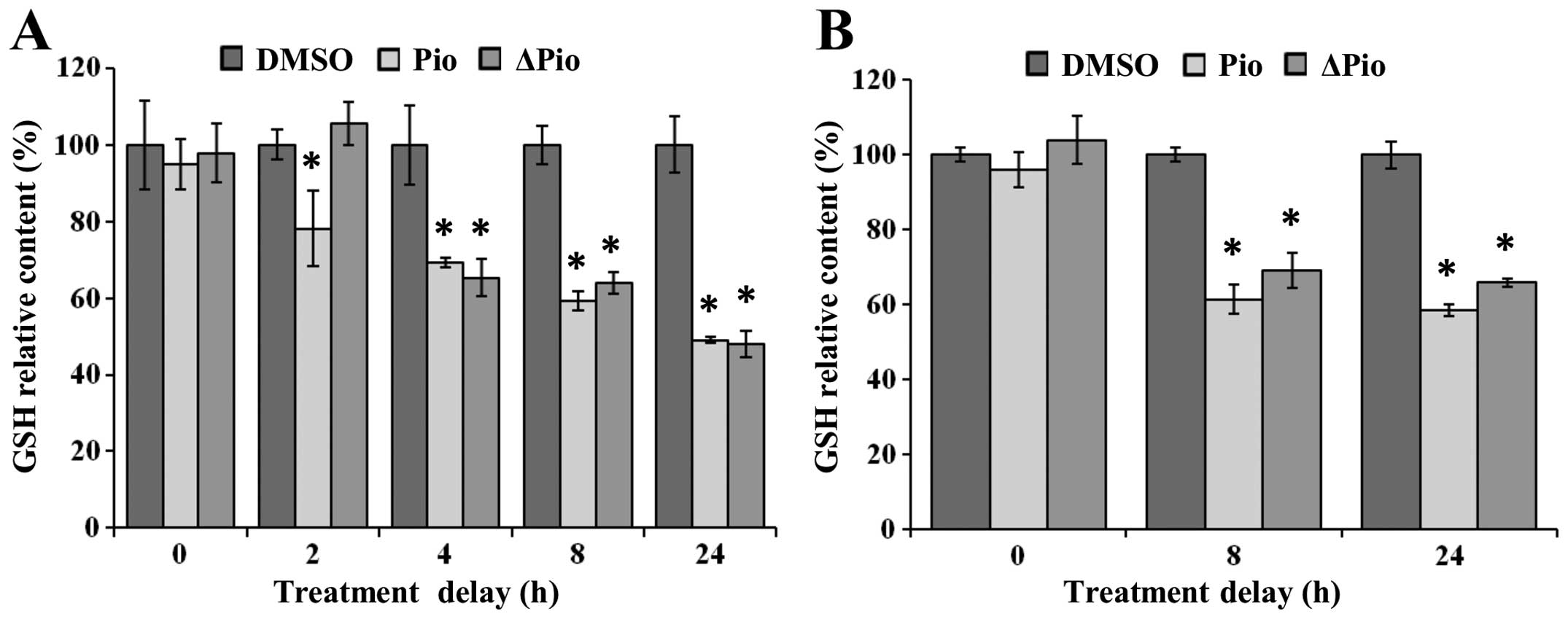 Intracellular GSH levels were determined by an HPLC method described by Lenton et al (13) with slight modifications using a C18-Thermo Hypersil column (Fisher Scientific, Illkirch, France) and 1.5 mM orthophtalaldehyde. Cells were grown in 25 cm2-flasks. Briefly, 48 h after seeding, cells were exposed to 50 μM Pio, 50 μM ΔPio or 3 μM ΔPGJ2 for various times, up to 24 h. When used, antioxidant was added 1 h before drug treatment. Cell layers were washed three times with ice-cold DPBS, then suspended with 10% (v/v) perchloric acid ice-cold solution/2 mM EDTA, pH 8.0. The homogenates were centrifuged at 15000 g for 15 min at 4°C. The supernatant were stored at −80°C until HPLC analysis. Perchloric acid-precipitated proteins (pellets) were solubilized in daily prepared 1 M NaOH prior to protein content determination. GSH contents were calculated as nano-mole of GSH/mg of protein. Data from DMSO-treated cells (control cells) and treated cells were compared and they are expressed relative to those obtained from control cells, taken as 100.