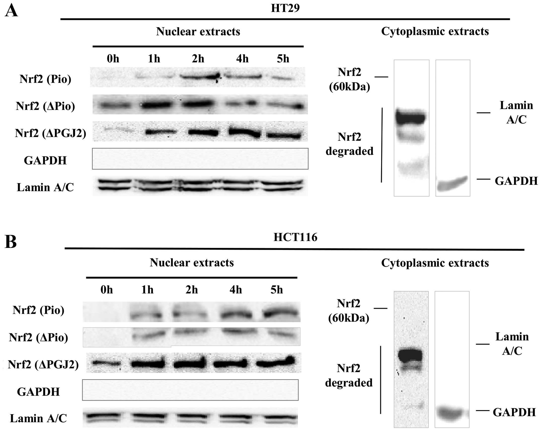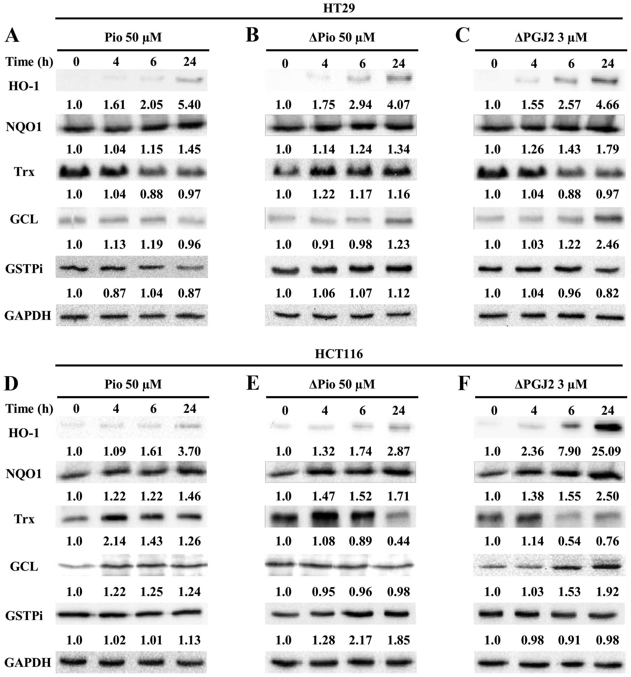 Activation of the Nrf2/Keap1 pathway is associated with redox changes within cells (7). We studied whether ΔPio treatment activated translocation of Nrf2 in the cell nuclei. These results were compared to those obtained after cell exposure to ΔPGJ2, known as a potent inducer of the Nrf2/Keap1 pathway (16) and the endogenous ligand of PPARγ (17). However, the molecule has been shown to induce apoptosis at a concentration higher than 10 μM in colorectal cells (18) but also in cells from other tissue origins (19). We assessed whether cell exposure to 3 μM ΔPGJ2 had any impact on colorectal cell growth and we showed that ΔPGJ2 treatment did not trigger cells to enter apoptosis (Fig. 3). As demonstrated by western blots performed with nuclear extracts, 3 μM ΔPGJ2 treatment enhanced dramatically Nrf2 nuclear translocation in both cell lines throughout the experiment (Fig. 9). ΔPGJ2 treatment enhanced HO-1, a Nrf2 target gene, at the protein level (Fig. 10C and F, respectively). Maximum HO-1 levels were achieved when HCT116 cells are exposed to ΔPGJ2 (25 times induction) for 24 h, as compared to that found in HT29 cells (4.7 times induction). Similarly, NQO1 was detected in HT29 and HCT16 cells and the protein levels were increased after cell exposure to ΔPGJ2. Moreover, GCL protein contents were also enhanced in ΔPGJ2-treated cells and it was associated with the increase of intracellular GSH levels starting 8 h after cell treatment (Table III). Addition of BSO, a specific inhibitor of GCL activity, abrogated ΔPGJ2-mediated GSH synthesis. Thus, at the dose used ΔPGJ2 had a protective effect on colorectal cells. As shown in Fig. 9, Nrf2 accumulated in cell nuclei from ΔPio or Pio-treated cells but differences existed depending on the cell line tested. In HT29 cells, maximum Nrf2 nuclear levels were found at 1 h in ΔPio-treated cells and at 2 h in Pio-treated cells (Fig. 9A). In contrast, Nrf2 translocation began 1 h after the HCT116 cell exposure to each drug and it stayed mostly constant during the experiment duration (Fig. 9B). We analysed which Nrf2 target gene could be activated during drug treatment. Whatever the cell line tested, HO-1 expression was induced demonstrating that HO-1 was involved in ΔPio-mediated oxidative stress. ΔPio or Pio-treatment increased HO-1 expression to a similar level whatever the cell tested (Fig. 10A,B and D,E respectively). Focusing on known Nrf2 target genes such as NQO1, GSTPi, thioredoxin and GCL, respective protein levels depended on the cell line tested and the treatment applied. NQO1 expression was increased at the protein levels, in Pio (Fig. 10A,D) and ΔPio treated cells (Fig. 10B,E). There were only small changes in GCL levels in Pio and ΔPio-treated HT29 or HCT116 cells (Fig. 10A,B and D,E respectively). GSTPi expression did not change dramatically upon molecule treatment whatever the cell line tested. Trx levels rose to a maximum after HCT116 cell exposure to Pio for 4 h (Fig. 10D), whereas its expression was often decreased in the other treatment conditions. Thus, activation of the Nrf2 pathway correlated well to an increase of reactive species production within the cells.