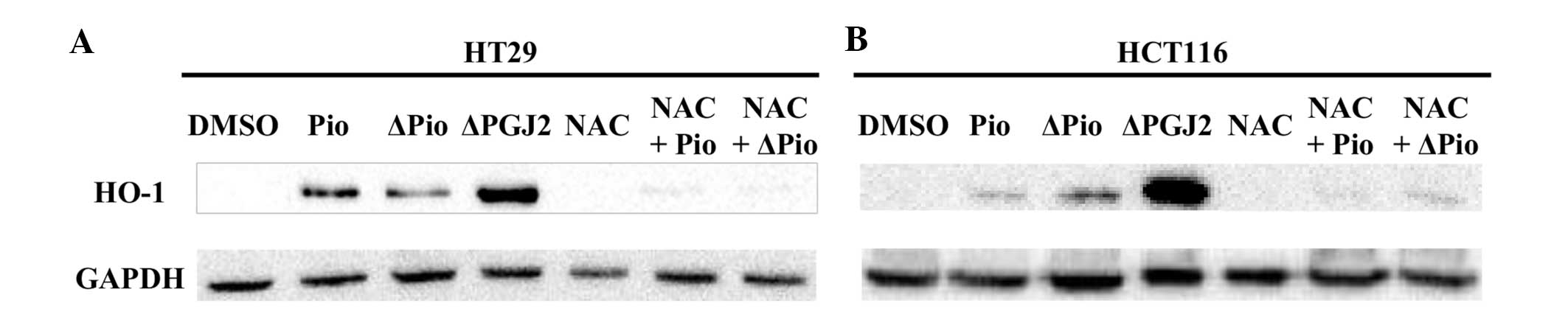 HO-1 expression is enhanced in stressed cells but its expression depends also on activation of diverse transduction pathways or a mechanism involving GSH depletion (7). Based on our results, notably the presence of reactive species and GSH depletion during ΔPio treatment, we assessed whether HO-1 expression could be modulated by antioxidants such as NAC (a thiol scavenger) (Fig. 11). Pre-treatment with NAC prevented the production of ROS within HT29 colorectal cells (Table II) and addition of the antioxidant inhibited almost completely ΔPio-induced HO-1 expression (Fig. 11A). These results were close to those obtained when HCT116 cells were tested (Table II and Fig. 11B).