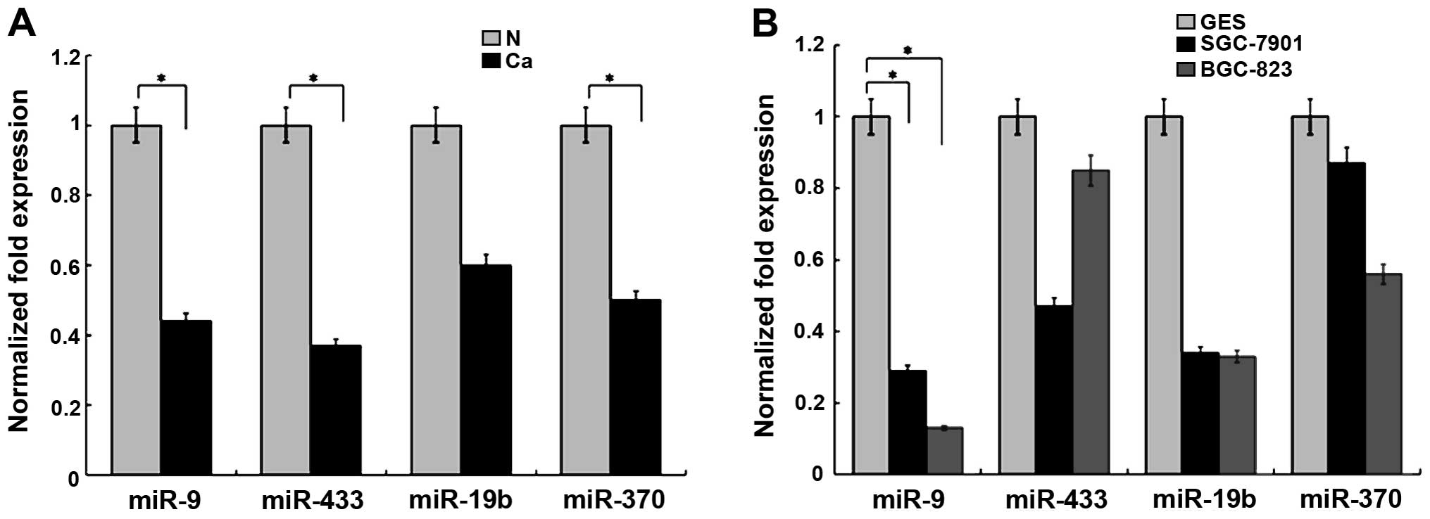 We measured expression of miR-9, miR-433, miR-19b, and miR-370 and found that they were all strongly repressed in GC samples compared to normal gastric mucosa. All miRNAs, except miR-19b, displayed significant differences in expression (p<0.05) (Fig. 2A). Compared to the normal gastric epithelial cell line GES-1, the four tested miRNAs all showed decreased expression in the GC cell lines SGC-7901 and BGC-823. However, miR-9 was the only miRNA of the four whose expression level was statistically significantly decreased (p<0.05) (Fig. 2B).