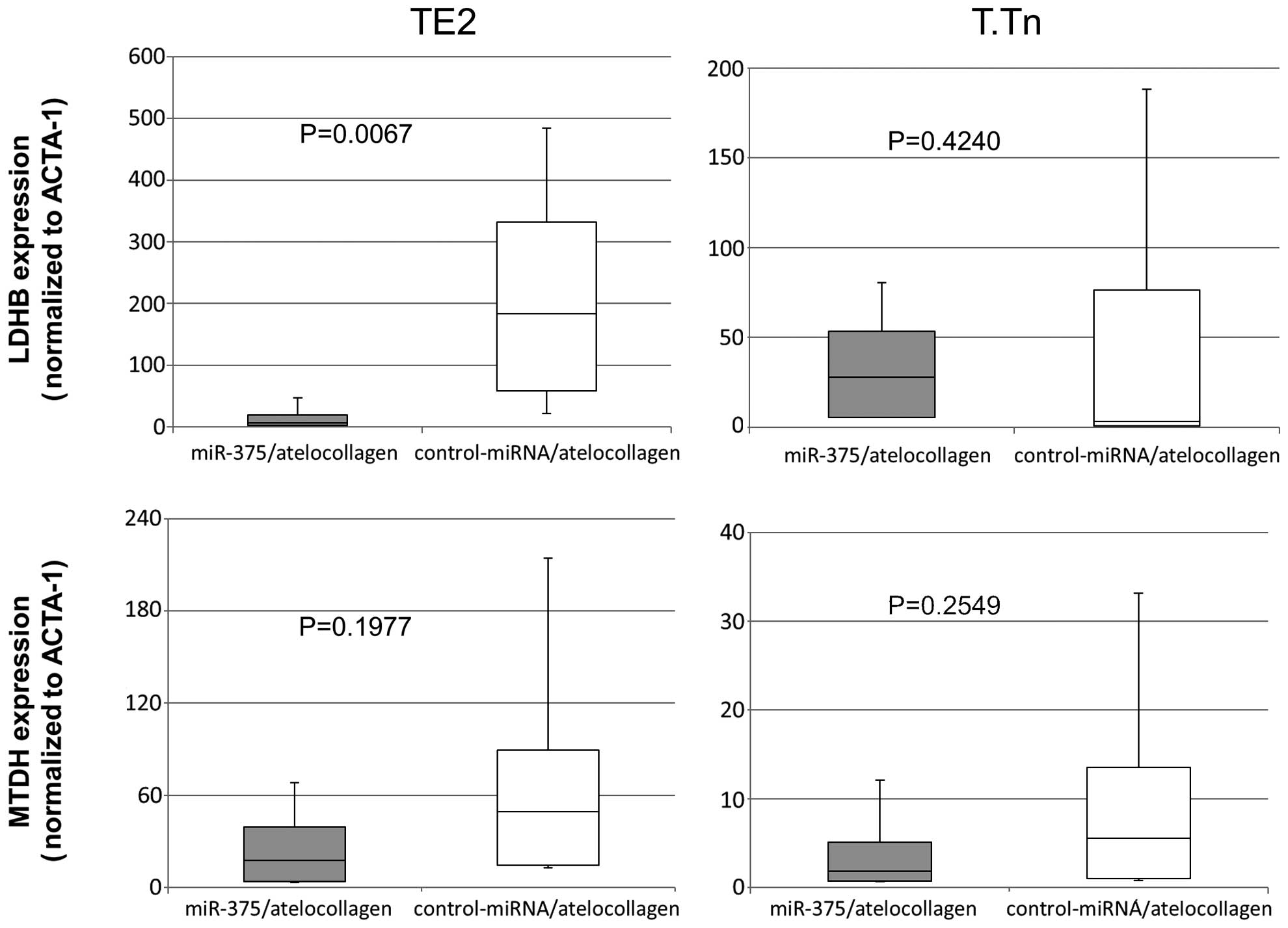 We prepared TE2 and T.Tn tumor-bearing mice, and divided them into four groups containing three animals each. As stated above, we injected the miR-375/atelocollagen or control-miRNA/atelocollagen complex into the xenografts by s.c. injection. The treatment was conducted one time, and the tumors were excised 24 h after the treatment. We extracted total RNA from the tumors and determined the LDHB and AEG-1/MTDH mRNA expression level. The mRNA expression level of these genes was compared between the miR-375 and control-miRNA groups.