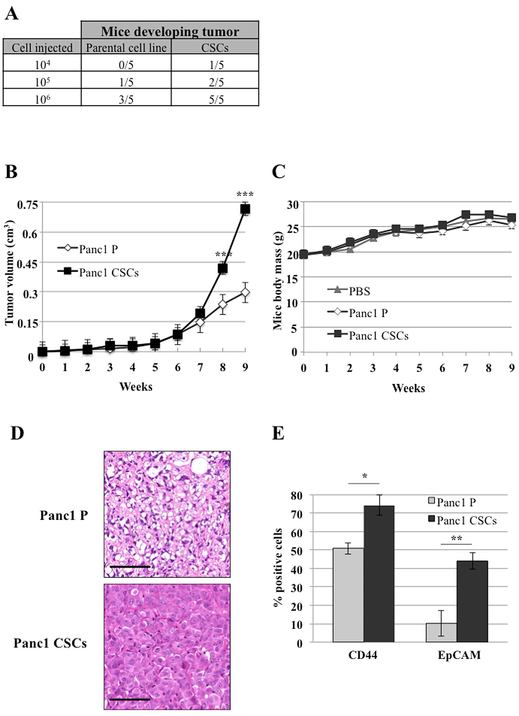 To evaluate the tumor-initiating capabilities of pancreatic CSCs in vivo, Panc1 CSCs and the parental cell line (1×104, 1×105 and 1×106 cells/mouse) were subcutaneously injected into nude female mice and the tumor size was monitored weekly. Fig. 4A shows that Panc1 CSCs possessed an increased tumor-seeding ability compared to the parental cell line. Furthermore, 1×106 Panc1 CSCs generated a larger tumor than the parental cell line (Fig. 4B) without influencing the body mass of mice (Fig. 4C). Histological assessment of tumor tissues revealed that CSC tumors were composed by a homogeneous population of cancer cells characterized by small nuclei, evident nucleoli and oncocytic cytoplasm, whereas parental cell tumors were constituted by a heterogeneous population of cells with clear/lipoblast-like features (Fig. 4D). No significant differences were observed concerning tumor necrosis or its distribution.