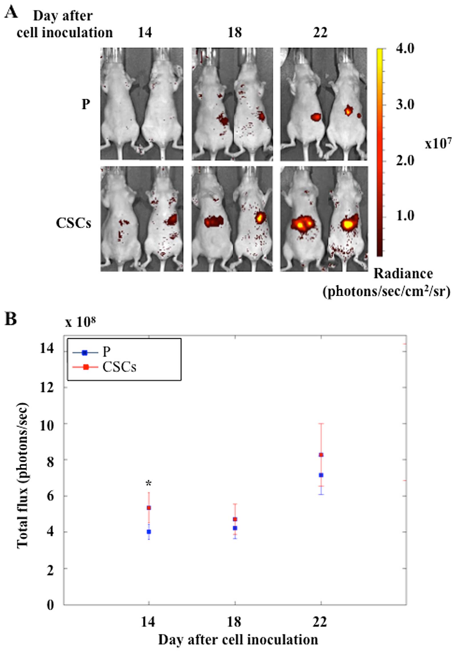 To evaluate the metastatic activity of pancreatic CSCs, we used an in vivo model of nude mice by injecting fluorescent cells (MiaPaCa2-RFP, as in Materials and methods) into the spleen. The growth of both parental and CSCs was evaluated and the optical images acquired at 14, 18 and 22 days after cell injection are shown in Fig. 5A. CSC metastases were well-detectable at the first time point, whereas parental metastases were detectable 4 days later. As shown in Fig. 5B, the total flux of the emitted visible light increased in both experimental groups. At all the three time points, CSC metastases showed a higher mean light emission with respect to parental metastases, but only at the 14th day the difference was statistically significant.