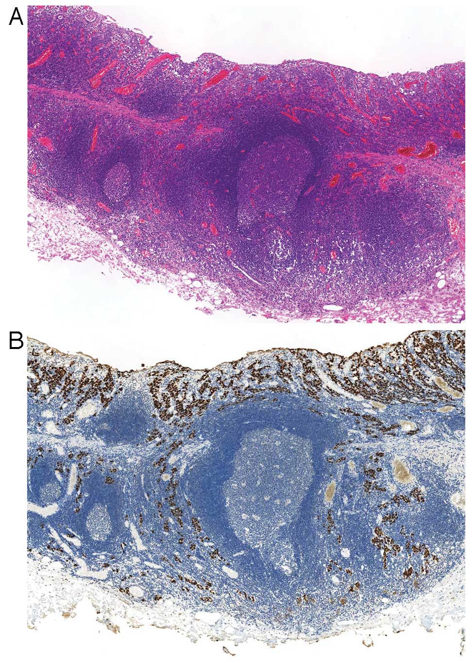 EBVaGC with conventional-type adenocarcinoma histology shows well to moderately differentiated adenocarcinoma with variable amount of infiltrating lymphocytes, and it is classified as an intestinal type gastric carcinoma in Lauren’s classification (33). Morphologically, it is almost identical to EBV-negative gastric carcinoma; therefore, EBER-ISH is necessary to identify the presence of EBV in carcinoma cells. Another subtype has been proposed called ‘carcinoma with Crohn’s disease-like lymphoid reaction,’ which is defined as a tumor accompanied by three or more lymphoid follicles with active germinal centers at the advancing edge of the tumor, fewer lymphocytes than tumor cells, frequent tubule or gland formation and minimal or no desmoplasia (34) (Fig. 3). This type represents a morphology intermediate between the typical LELC-type and conventional-type adenocarcinoma and could be included in GCLS.