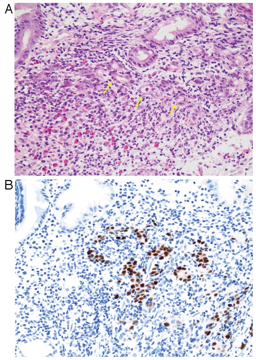Shinozaki A, Ushiku T and Fukayama M: Prominent Mott cell proliferation in Epstein-Barr virus-associated gastric carcinoma. Hum Pathol. 41:134–138. 2009. View Article : Google Scholar : PubMed/NCBI | |