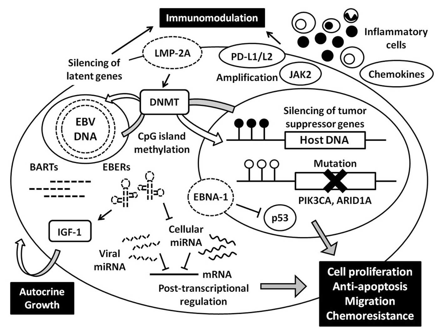 EBVaGC is a distinct subtype of gastric carcinoma with regard to both its clinicopathological and molecular features. Recent advances in comprehensive genome-wide analysis have provided novel findings regarding the genetic and epigenetic abnormalities that are unique to EBVaGC, and these various factors cooperate to develop carcinoma (Fig. 6). Global and non-random CpG island hypermethylation is characteristic feature of EBVaGC, and epigenetic silencing of various genes, especially tumor suppressor genes, play a key role in carcinogenesis. Furthermore, increased activation of DNA methyltransferase by LMP-2A also induces hypermethylation of EBV genome itself, resulting in limited expression of latent genes, which may benefit in escaping from immune response by the host. Viral specific transcripts including latent genes and miRNAs have oncogenic properties such as increased cell proliferation and motility, anti-apoptotic effect, and chemoresistance, which help tumor progression. Although EBVaGC is relatively genomically stable, frequent mutations in the PIK3C and ARID1A genes are found; and the roles of these mutations in carcinogenesis are expected to be clarified in the future studies. Furthermore, there remain questions regarding how and when these mutations occur, what triggers hypermethylation, and how host cells regulate the transcription of viral genes. Finally, the interaction between carcinoma and inflammatory cells is another key to understand its carcinogenesis, which will also benefit the development of disease-specific therapies.