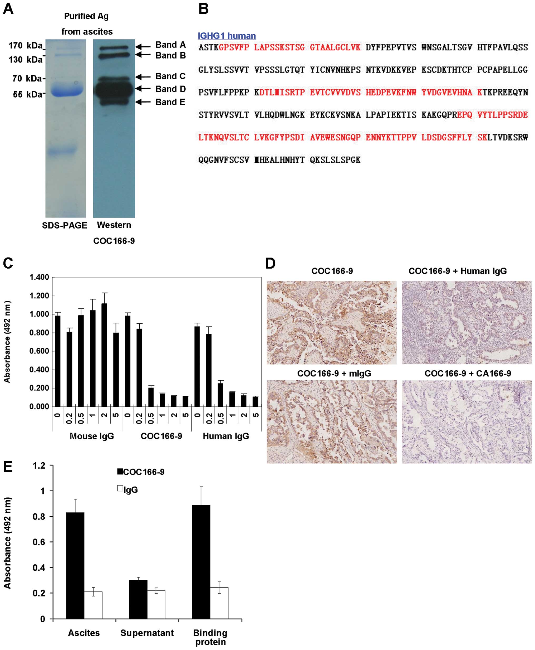 To identify the CA166-9, ovarian cancer ascites were subjected to the immunoaffinity column chromatography. The purified antigens were resolved by SDS-PAGE (Fig. 2A, left) and probed with the COC166-9 by western blotting (Fig. 2A, right). Five protein bands at 170, 130, 70 55 and 45 kDa were successfully purified from the ovarian cancer ascites and were named as CA166-9 band A, B, C, D, and E, respectively. By mass spectrometry analysis, we obtained 13 peptide sequences from band A, 23 peptide sequences from band B, 16 peptide sequences from band C, 18 peptide sequences from band D, and 14 peptide sequences from band E. The peptides were all matched to human immunoglobulin γ-1 heavy chain (IGHG1) constant region by basic local alignment search tool (MASCOT) homology search (Fig. 2B). ELISA assay revealed that both purified CA166-9 and human IgG could abolish COC166-9's reaction with ovarian cancer ascites in a dose-dependent manner, however purified mouse IgG had no inhibitory effect (Fig. 2C). Similarly, results of immunohistochemistry inhibition analysis demonstrated that staining of successive sections of ovarian cancer specimens by COC166-9 was interfered by purified human IgG and CA166-9, but not by mouse IgG (Fig. 2D). Since the streptococcal protein G binds to the Fc fragment of IgG (16), it is reasonable to assume that the putative CA166-9, IGHG1 constant region protein could also associate with protein G. To confirm this predication, immunoprecipitation was performed with protein G-conjugated beads plus ascites solution from ovarian cancer patient. The ascites, protein eluted from protein G-conjugated beads after incubated with the ascites, and ascites after absorbed with the protein G were, respectively, coated onto the microtiter plates for ELISA assay with COC166-9. The results showed that COC166-9 had strong positive reactivity with the ascites or eluted protein, but a negative reactivity with the ascites after being absorbed with the protein G (Fig. 2E). These results indicated the antigen recognized by COC166-9 was IgG-like protein.