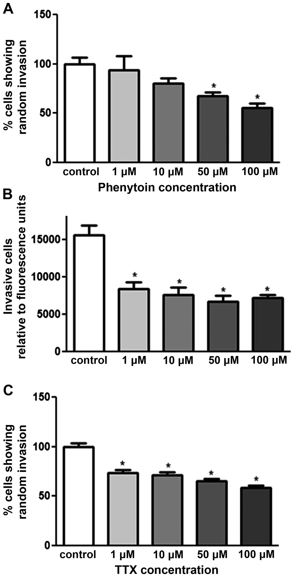 The agarose invasion assay was used to determine the effect of VGSC inhibitors on pII invasion towards serum components. As shown in Fig. 3A and C, both drugs exhibited dose-dependent inhibition; PHT exerted its effect at 50 and 100 μM with 40 and 50% inhibition respectively. TTX exhibited its effect from a lower concentration (1 μM) with 25% inhibition. Matrigel invasion assay was used to confirm the anti-invasive property of PHT. Fig. 3B shows a significant inhibitory effect of PHT at all doses used (1–100 μM) with 50% inhibition.