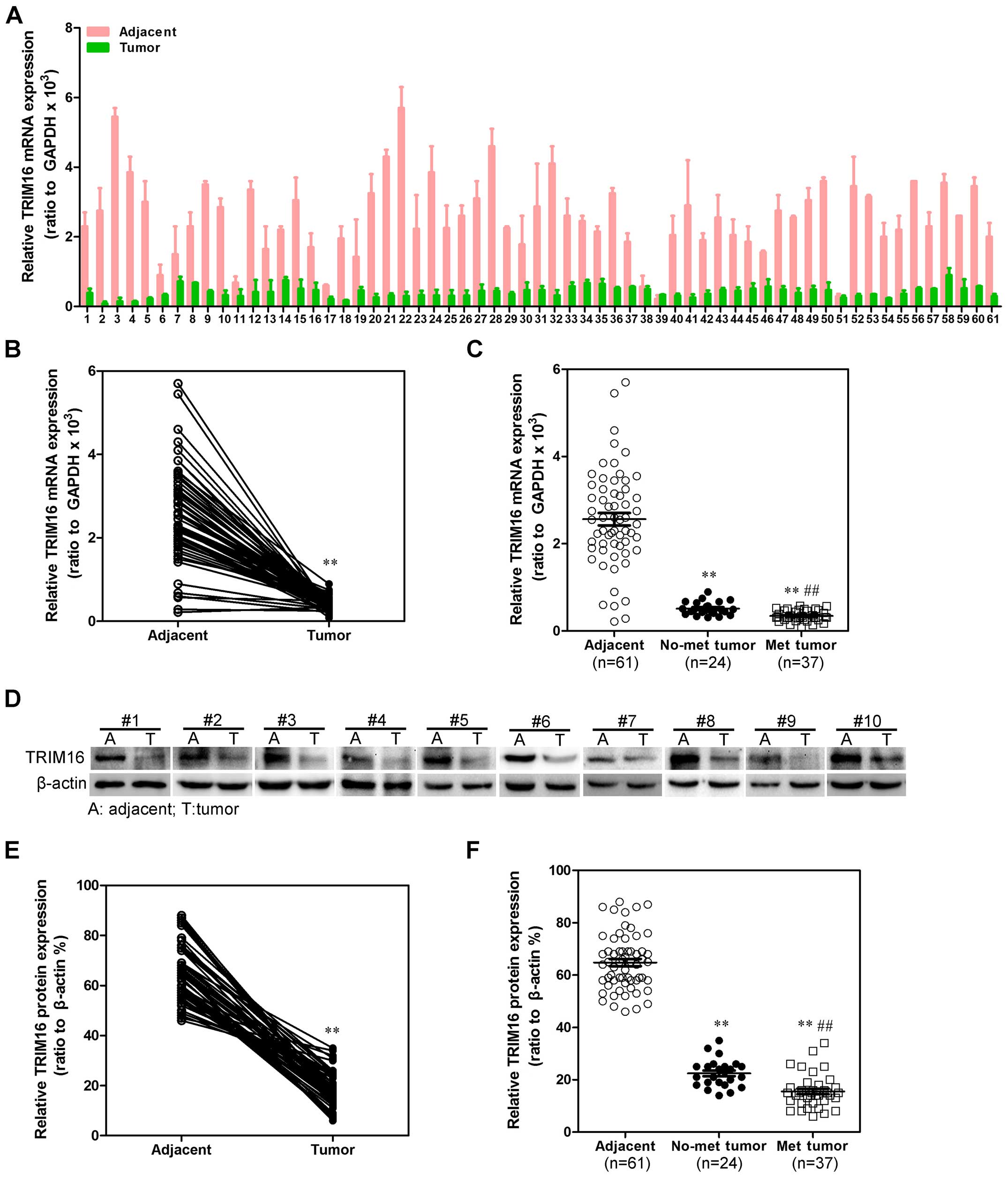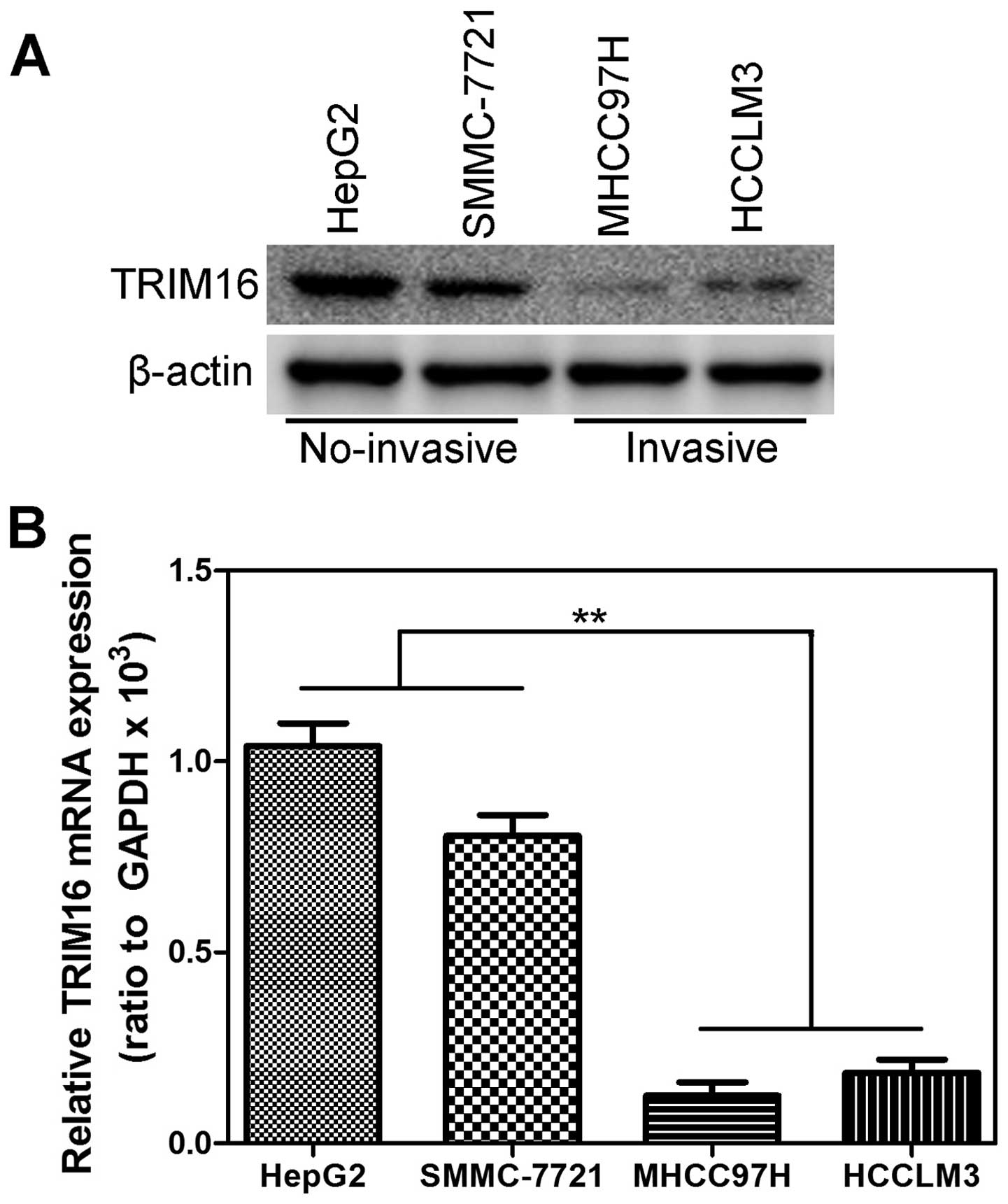 To investigate whether TRIM16 might be involved in HCC, the mRNA expression level of TRIM16 in HCC tissues and their matched normal adjacent tissues was determined by qRT-PCR in 61 samples (Fig. 1A). As compared with normal tissues, HCC specimens showed lower expression of TRIM16 (Fig. 1B). We then analyzed TRIM16 expression in HCCs without or with metastasis property; we found that TRIM16 mRNA lower expression was significantly correlated with metastasis property in HCC tissues (Fig. 1C). We examined TRIM16 protein expression in the same HCC samples by western blot analysis (Fig. 1D). We observed that the level of TRIM16-positive cells was markedly lower in HCC tissues than the level in the normal liver tissues (Fig. 1E). Most importantly, TRIM16 lower expression was consistently significantly correlated to distant metastasis in these HCC samples (Fig. 1F). As showed in Fig. 2, expression level of TRIM16 protein (Fig. 2A) and mRNA (Fig. 2B) in invasive HCC cell lines was lower than that in the no-invasive HCC cell lines. These data demonstrated that the downregulation of TRIM16 might be relevant to invasive property of HCC.