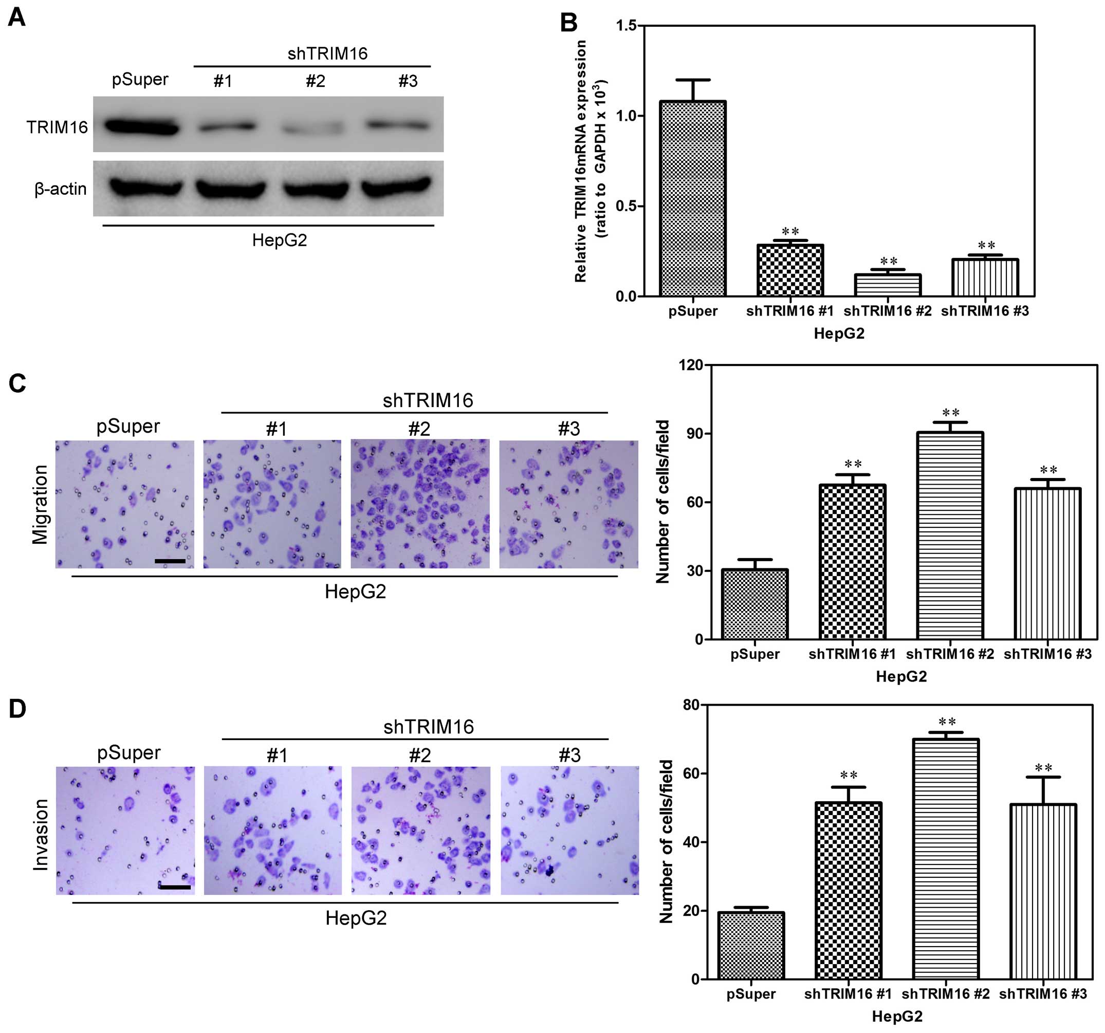 To investigate the effect of TRIM16 knockdown on hepatoma carcinoma cell migration and invasion, HepG2 human hepatoma cell line, was first infected with shTRIM16 or the control. We used western blot and qRT-PCR analyses to detect transfection efficiency. Compared with the control cells, the HepG2 cells, transfected with the TRIM16 shRNA plasmid, displayed significantly decreased TRIM16 expression at the protein and mRNA levels (Fig. 3A and B). Boyden chamber assay was first used to assess the influence of TRIM16 on HCC cell migration to detect the effect of TRIM16 on HCC cells. As indicated by the Transwell assay and Matrigel assay, knockdown of TRIM16 expression significantly inhibited HCC cell migration and invasion (Fig. 3C and D). These results further demonstrated that silencing TRIM16 promotes HCC cell migration and invasion in vitro.