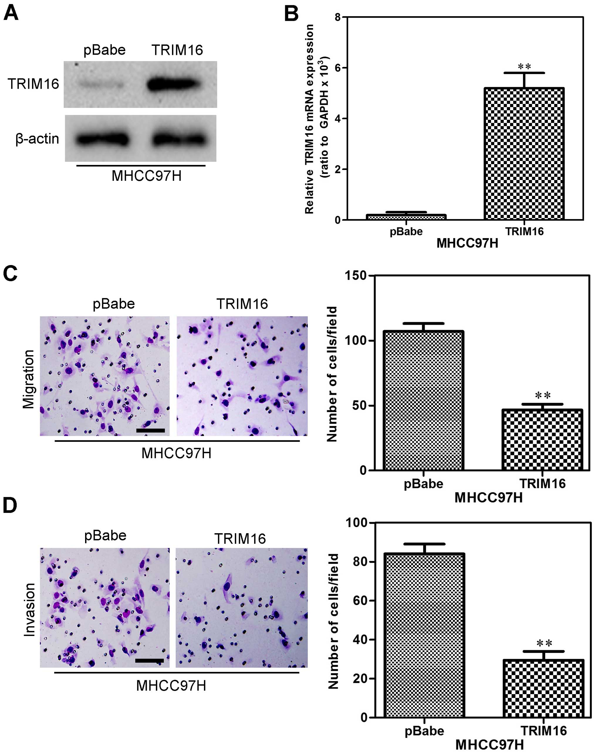 We also used MHCC97H cells to establish a stable cell line that constitutively overexpressed TRIM16. The transfection efficiency was confirmed using western blot and qRT-PCR analyses. As shown in Fig. 4A and B, the MHCC97H cells that had been transfected with the TRIM16 expression plasmid displayed significantly increased TRIM16 expression both at the protein and mRNA levels compared with the vector cells. In order to measure the effect of TRIM16 on HCC cell migration and invasion, the effect of TRIM16 on HCC cell migration was assessed by the Boyden chamber assay. The overexpression TRIM16 markedly reduced the migratory (Fig. 4C) and invasive (Fig. 4D) capacity of MHCC97H cells. These results indicate that ectopic TRIM16 expression inhibits HCC cell migration and invasion in vitro.