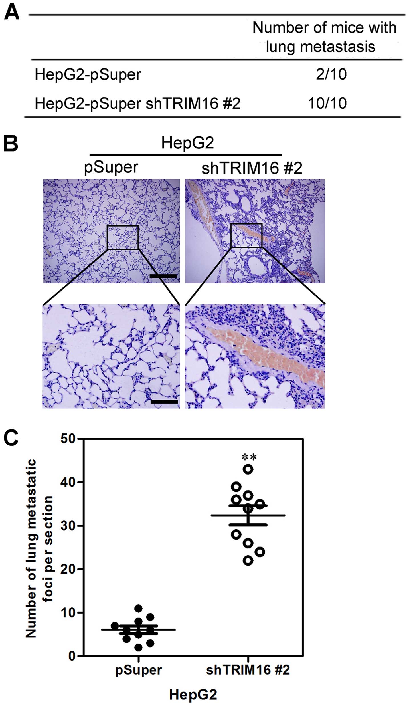 We then investigated the functional relevance of TRIM16 for metastasis in vivo. HepG-2-shTRIM16 #2 and its control cells were injected into nude mice through the tail vein. We observed that silencing TRIM16 not only significantly increased the number of mice with distant metastasis (Fig. 5A), but also markedly increased the number of metastatic tumors in the lungs of each mouse (Fig. 5B and C). Therefore, the in vivo results further demonstrate the critical role of TRIM16 in HCC metastasis.