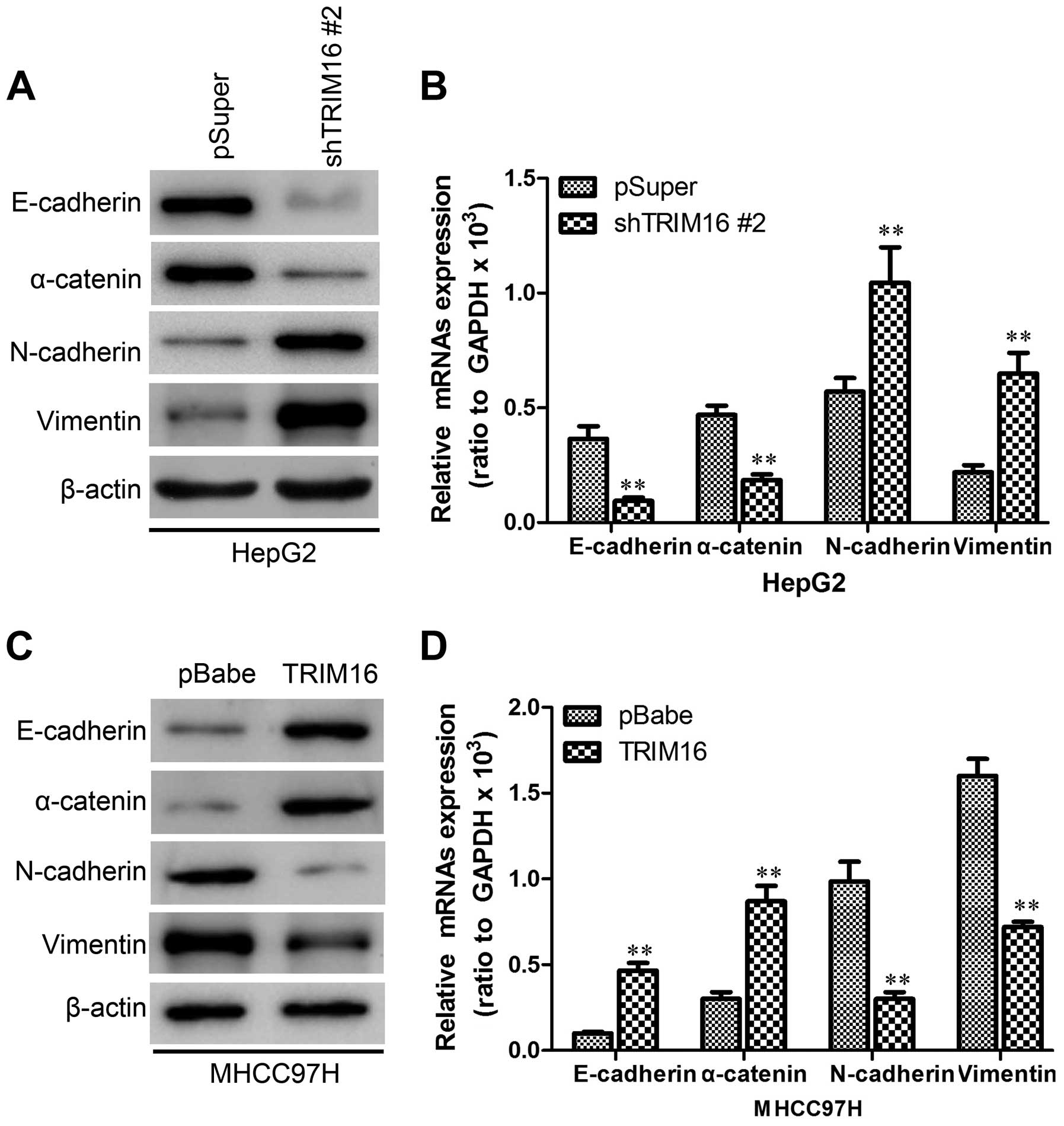 Lipofectamine transfection and TRIzol reagents were purchased from Invitrogen (Grand Island, NY, USA). MG132 was purchased from Selleckchem (Houston, TX, USA). Antibodies against TRIM16, E-cadherin, N-cadherin, vimentin, HA, Myc, snail, slug, ZEB1, ZEB2 and β-actin antibodies were from Cell Signaling Technology (Danvers, MA, USA). Anti-α-catenin antibody and Matrigel were from BD (Franklin Lakes, NJ, USA). Unless otherwise noted, all other chemicals were from Sigma (St. Louis, MO, USA).