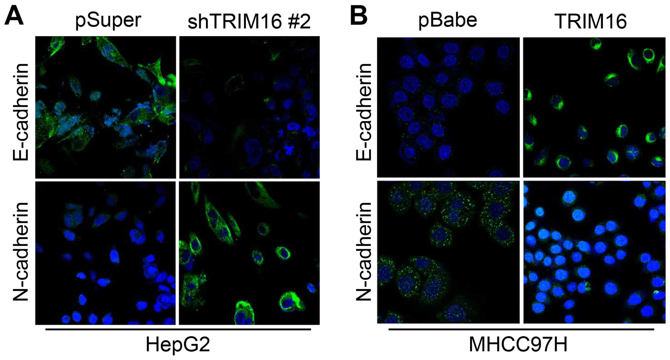During the establishment of these cell lines, we observed that HepG-2-shTRIM16 cells exhibited fibroblastic morphology, compared to their respective control cells (data not shown). This observation was further confirmed by western blot and immunofluorescence analyses of epithelial and mesenchymal molecular marker expression. We showed that TRIM16 knockdown decreased the levels of epithelial markers (E-cadherin and α-catenin) and increased the levels of mesenchymal markers (N-cadherin and vimentin) (Figs. 6A and 7A). Moreover, expression levels of mRNA correlated with the corresponding protein levels (Fig. 6B), suggesting that TRIM16 affected the expression of epithelial and mesenchymal markers at the transcript level. Conversely, MHCC97H-TRIM16 cells reverted to a mesenchymal phenotype as compared to their respective control cells (data not shown). Consistent with this, ectopic TRIM16 expression resulted in an increase in expression of epithelial markers, and a decrease in expression of mesenchymal markers (Figs. 6C and D and 7B).