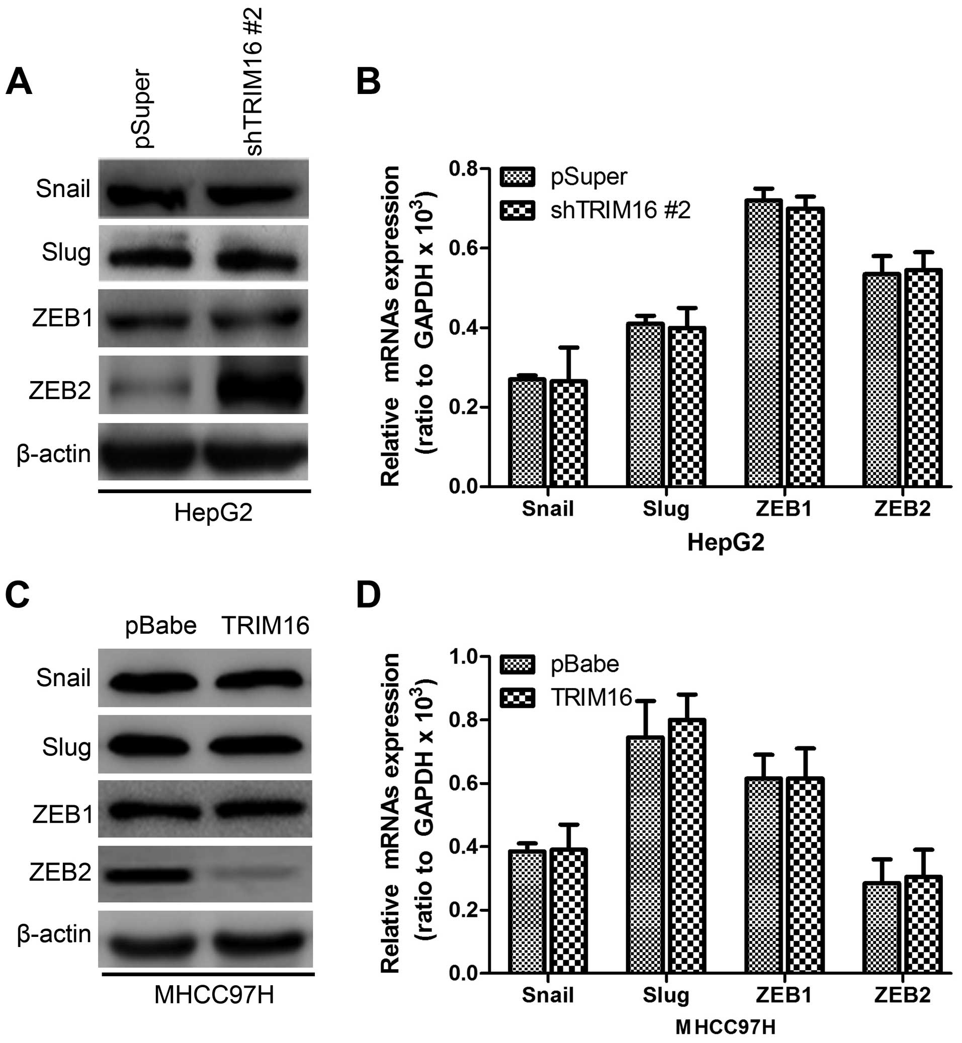 To better understand the mechanisms by which TRIM16 engaged in the EMT program, we assessed the expression of the EMT regulating genes, such as Snail, Slug, ZEB1 and ZEB2, on HepG2-shTRIM16, MHCC97H-TRIM16 and their control cells. The results shown that HepG2-shTRIM16 cells exhibited greatly increased ZEB2 expression at protein level (Fig. 8A), whereas, ectopic TRIM16 in MHCC97H cells markedly decreased ZEB2 expression at protein levels (Fig. 8C). While ZEB2 mRNA level had no significant change in either TRIM16 knockdown or ectopic expression (Fig. 8B and D), indicating that the regulation function of TRIM16 on ZEB2 expression only took place on the post-transcriptional level.