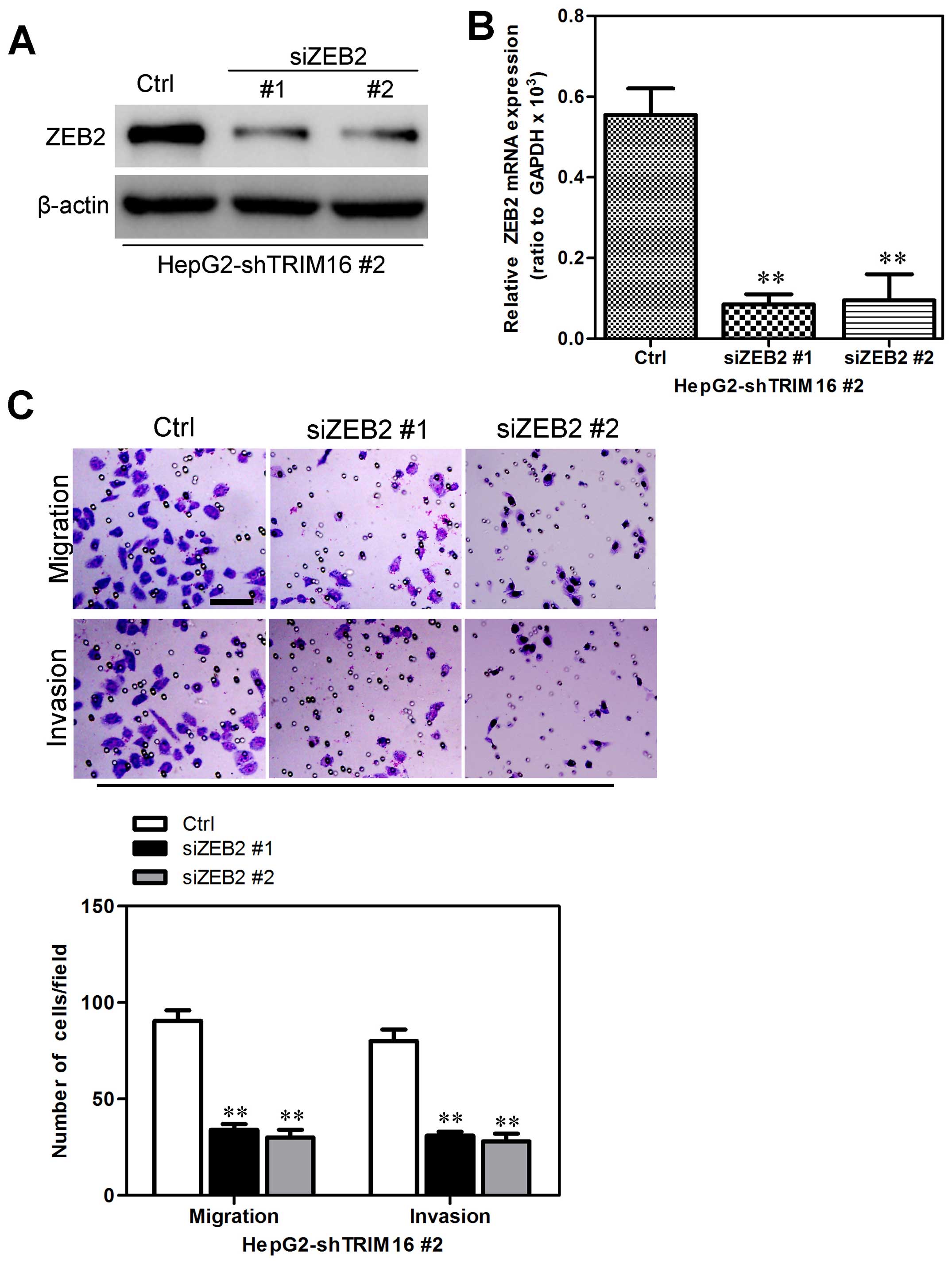 We transfected HepG2-shTRIM16 cells with ZEB2 siRNAs to silence ZEB2 gene expression to investigate whether TRIM16-induced metastatic capacity was mediated by ZEB2 expression (Fig. 10A and B). It was found that knockdown of ZEB2 in HepG2-shTRIM16 cells were accompanied by the reduction of migratory and invasive capacities (Fig. 10C). Collectively, these results show that ZEB2 mediates shTRIM16-induced migration and invasion in HCC cells.