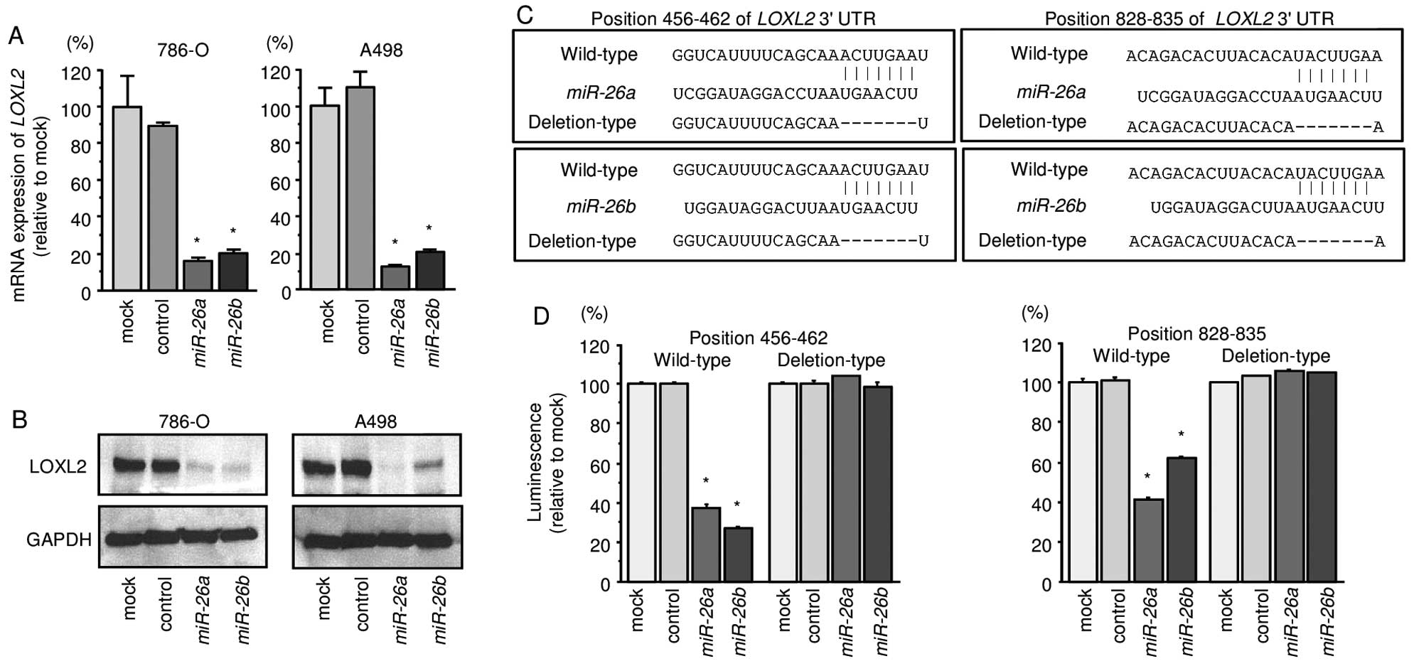 Next, to investigate whether LOXL2 mRNA had target sites for miR-26a or miR-26b, we performed luciferase reporter assays in 786-O cells. We used vectors encoding either the partial wild-type sequence of the 3′-UTR of LOXL2, including the predicted miR-26a/b target sites, or deletion vectors lacking the miR-26a/b target sites. We found that the luminescence intensities were significantly reduced by transfection with miR-26a or miR-26b and vectors carrying the wild-type 3′-UTR of LOXL2, whereas transfection with deletion vectors blocked the decrease in luminescence. These data suggested that miR-26a or miR-26b bound directly to specific sites in the 3′-UTR of LOXL2 (Fig. 3C and D).