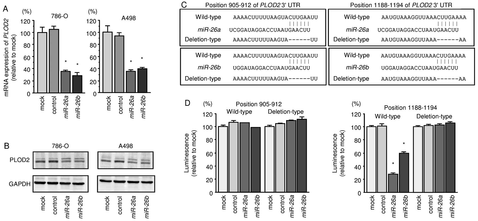 In conclusion, miR-26a and miR-26b were significantly downregulated in ccRCC clinical specimens and appeared to function as tumor suppressors through regulation of collagen cross-linking enzymes, LOXL2 and PLOD2, both of which function as oncogenes in this disease. The identification of novel molecular targets and pathways regulated by the tumor-suppressive miR-26a and miR-26b may lead to a better understanding of ccRCC and the development of new therapeutic strategies to treat this disease.