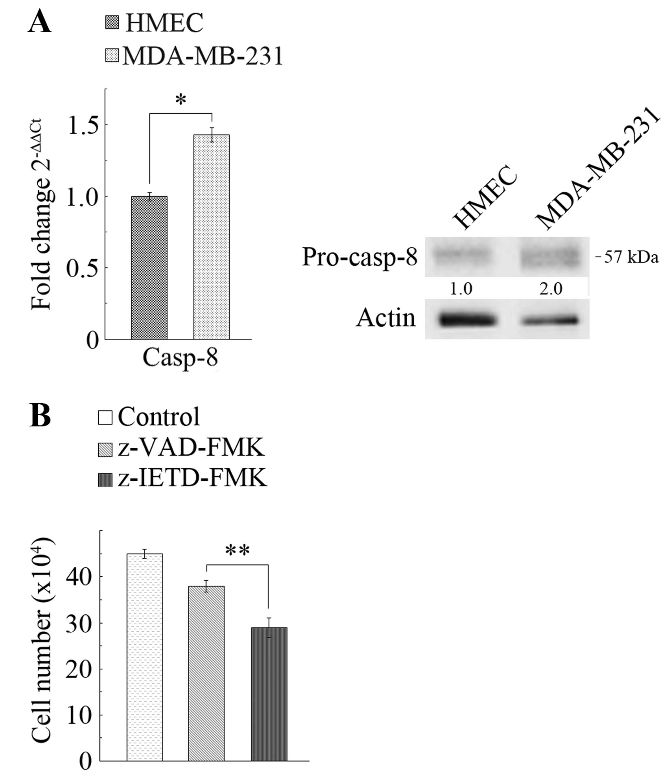 In this report, we demonstrated that in MDA-MB-231 breast cancer cell line, casp-8 exhibits RNA and protein levels markedly higher than in the normal human breast epithelial cell line HMEC.