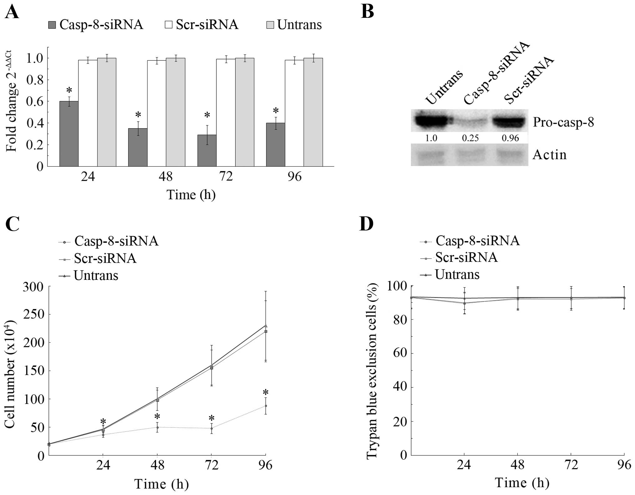 To evaluate whether casp-8-knockdown modified the growth rate of MDA-MB-231 cells, untransfected cells and cells transfected with scr-siRNA or with casp-8 siRNA were analysed (0–96 h) for cell proliferation. Through cell counting, we discovered (Fig. 2C) that upon casp-8 knockdown, cell number progressively lowered with respect to untransfected or scr-siRNA-transfected cells. In particular, at 24, 48 and 72 h after transfection, growth rate decreased by 20, 50 and 70% respectively; then, at 96 h, the decrease slightly diminished (62%) with an overall trend, which strongly agreed with what was observed for casp-8 mRNA after the casp-8 si-RNA transfection. Interestingly, the strong reduction in growth rate induced by casp-8-knockdown did not affect cell viability, as the trypan blue exclusion assay showed (Fig. 2D).