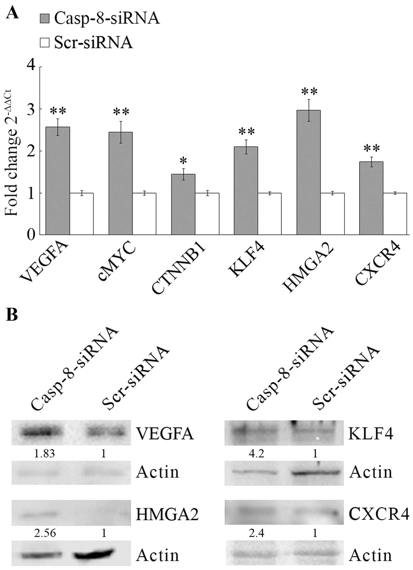 To assess the metastatic capacity of MDA-MB-231 cells, the gene expression profiles of the meta-static markers after casp-8 knockdown were also measured. As reported in Fig. 4A, the qRT-PCR analysis of a panel of meta-static markers showed a potent increase in the expression of all the metastatic stimulator genes studied. In particular, casp-8 knockdown increased the expression of VEGFA (2.6-fold), C-MYC (2.4-fold), CTNNB1 (1.4-fold), Krüppel-like factor 4 (KLF4) (2.1-fold), HMGA2 (2.9-fold), and CXCR4 (1.7-fold). Western blot analysis of VEGFA, HMGA2, KLF4 and CXCR4, showed similar increases in protein levels (Fig. 4B).