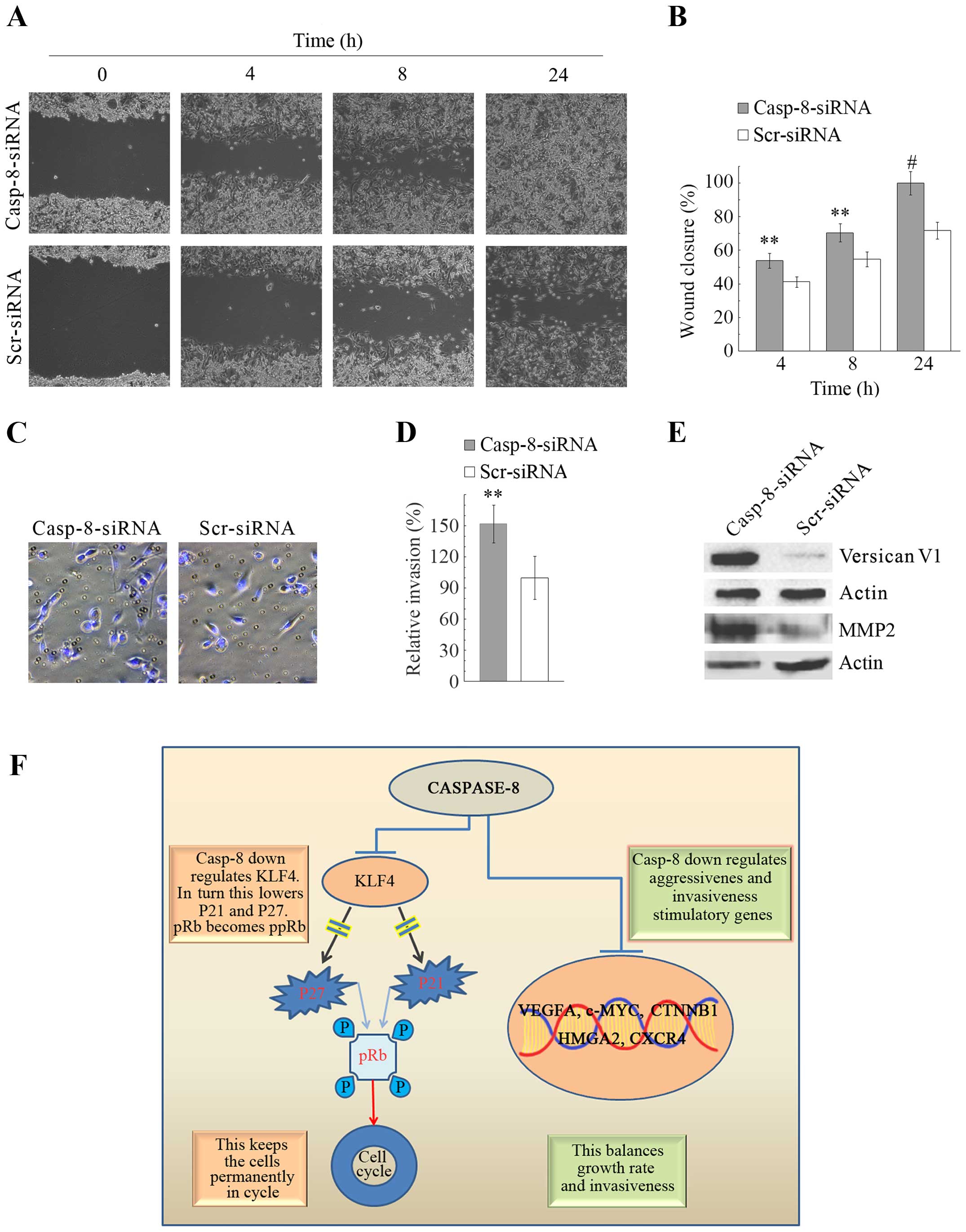 In conclusion, in light of the unusual roles played by casp-8 in various cancer cell types, and of the results by us obtained in MDA-MB-231 cells after casp-8-knockdown, we suggest that in MDA-MB-231 cells, casp-8 could be sucked towards non-canonical functions. In these cells, casp-8 could be aimed at maintaining a balance between cell proliferation and invasiveness. To this aim, downregulating KLF4, which in turn may downregulate p21 and p27 with consequent hyperphosphorylation and inactivation of pRb, would be an excellent machinery exploited by casp-8 to keep MDA-MB-231 cells permanently in cycle. Simultaneously, casp-8 could tightly control the levels of the stimulatory aggressiveness and invasiveness as VEGFA, C-MYC, CTNNB1, HMGA2, CXCR4, VERSICAN V1 and MMP2, so that the cancer cells could balance growth rate and invasiveness (Fig. 5F). We believe that the unusual roles played by casp-8 in MDA-MB-231 cells should be further explored, in order to understand whether and how it might be identified as a molecular therapeutic target.